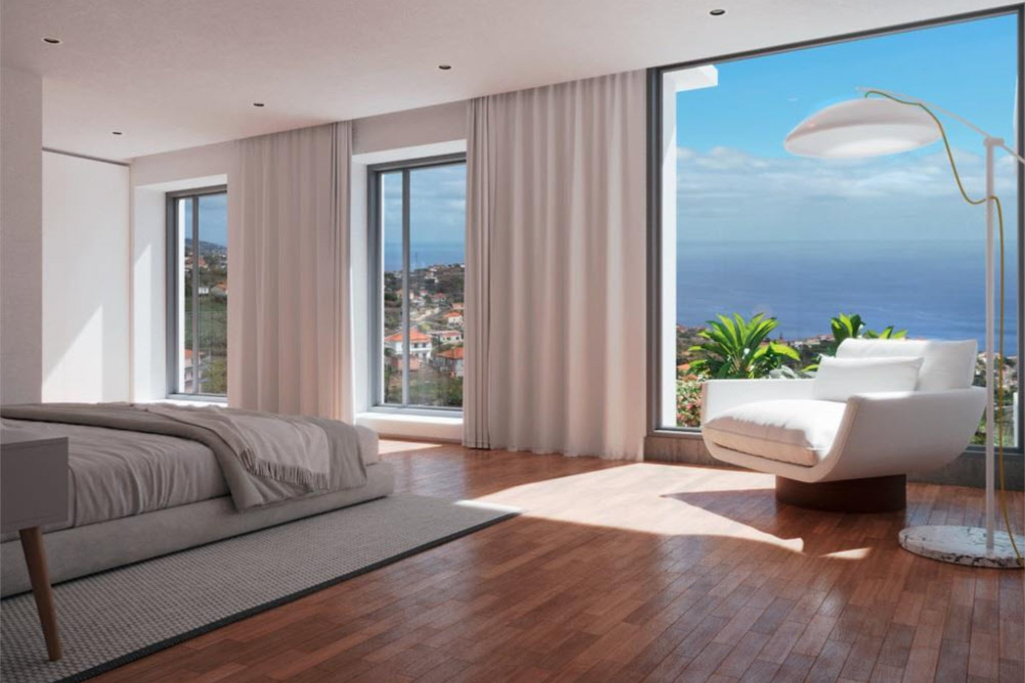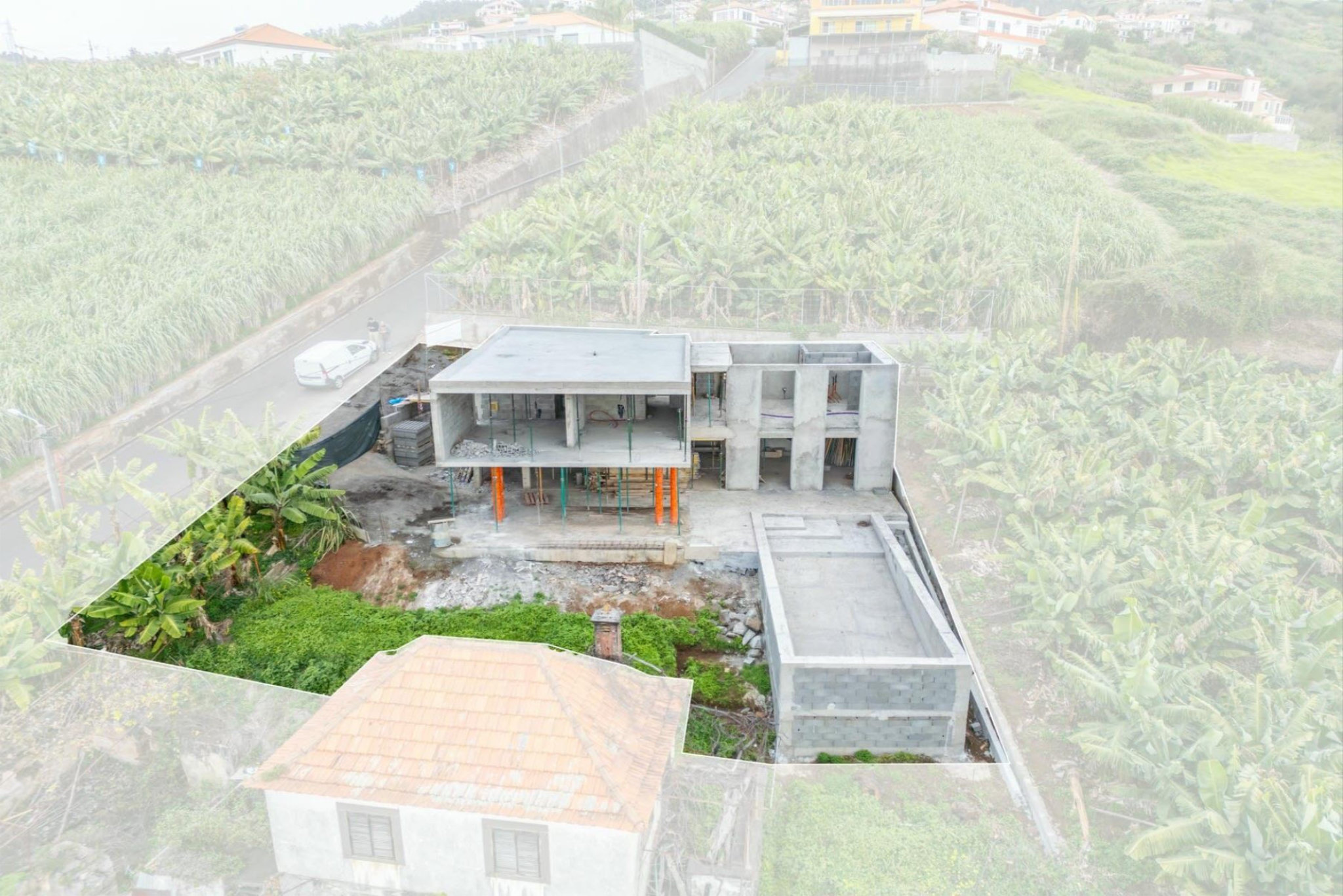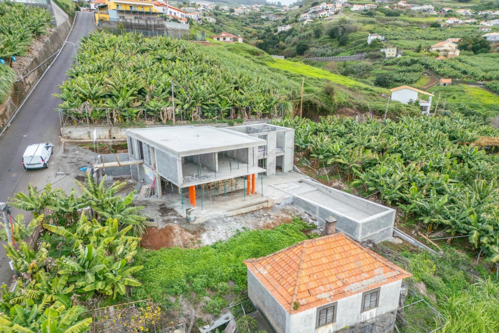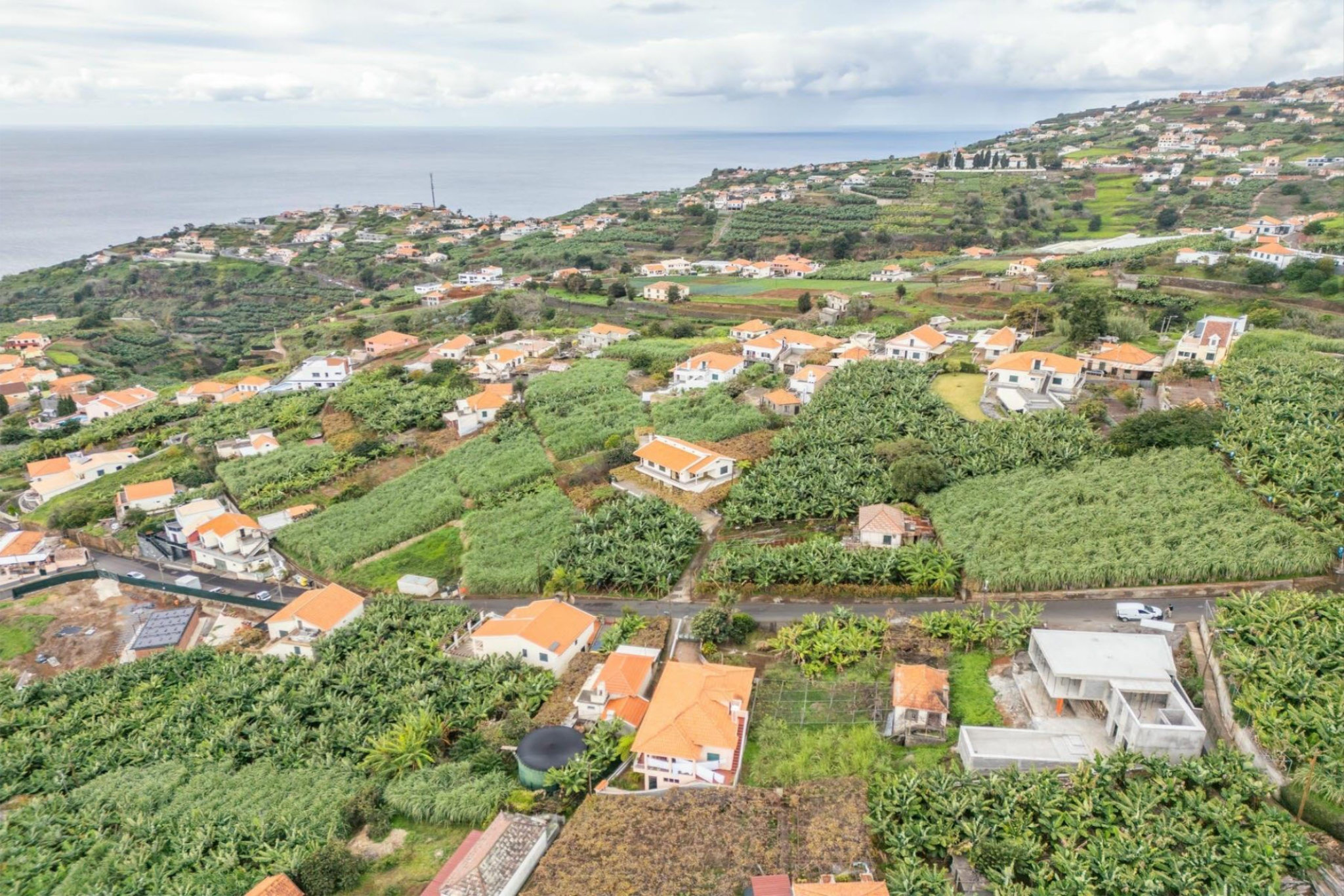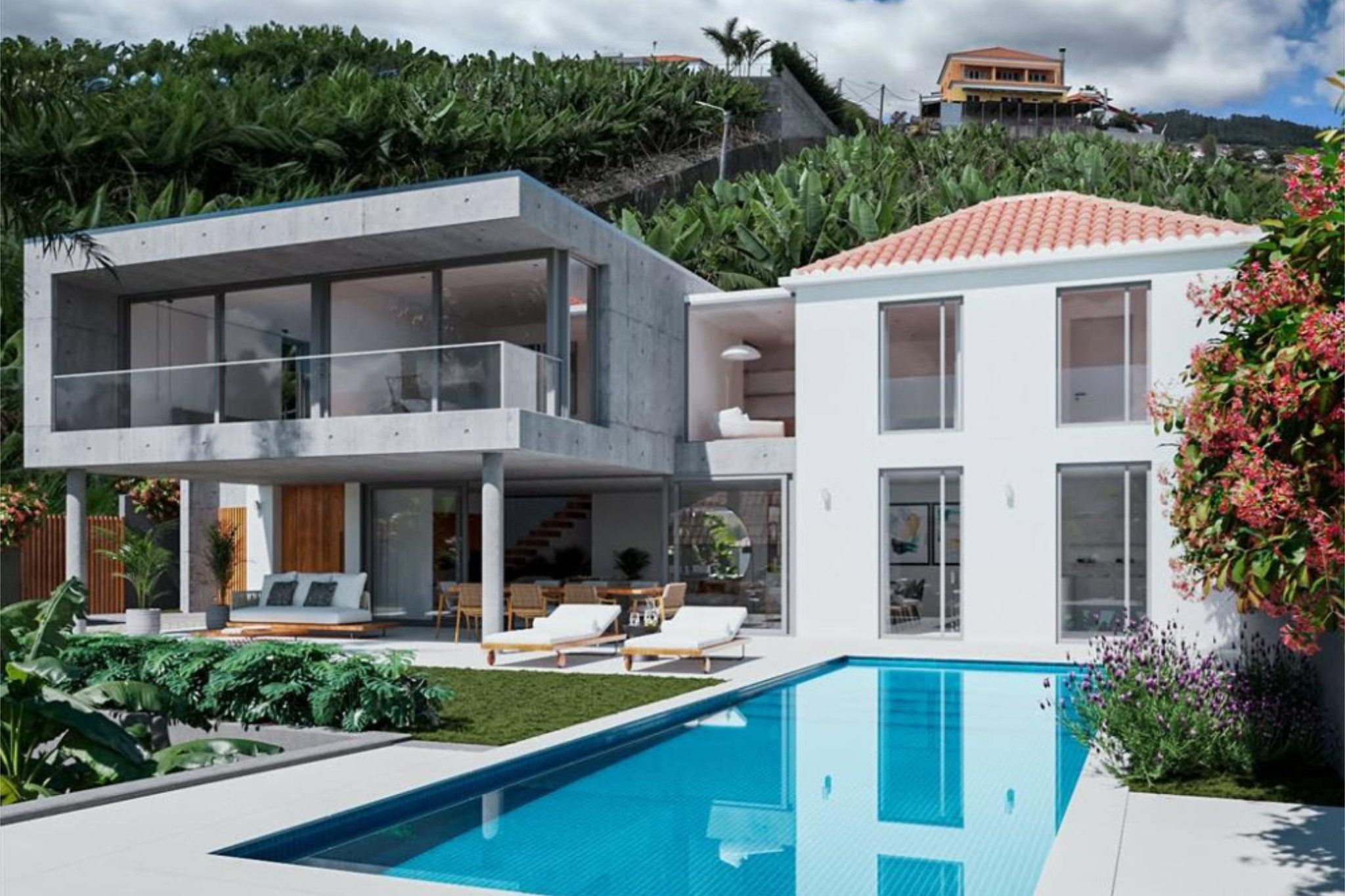 Im Obergeschoss finden Sie drei geschmackvoll gestaltete Schlafzimmer, eines davon als luxuriöse Suite mit eigenem Badezimmer. Zwei weitere Schlafzimmer teilen sich ein zusätzliches Badezimmer, das ebenfalls keine Wünsche offen lässt. Die Villa begeistert nicht nur mit ihrem Inneren, sondern auch mit einer atemberaubenden Außenanlage. Die Poolterrasse mit einem großen, einladenden Pool wird von einem gepflegten Garten mit alten Palmen umrahmt und bietet den perfekten Platz zum Entspannen. Trotz der zentralen Lage, nur 25 Minuten von Funchal entfernt, genießen Sie hier absolute Ruhe und Privatsphäre. Lokale Restaurants und Einkaufsmöglichkeiten sind in nur fünf Minuten erreichbar – ideal für all jene, die das Leben in vollen Zügen genießen möchten.
