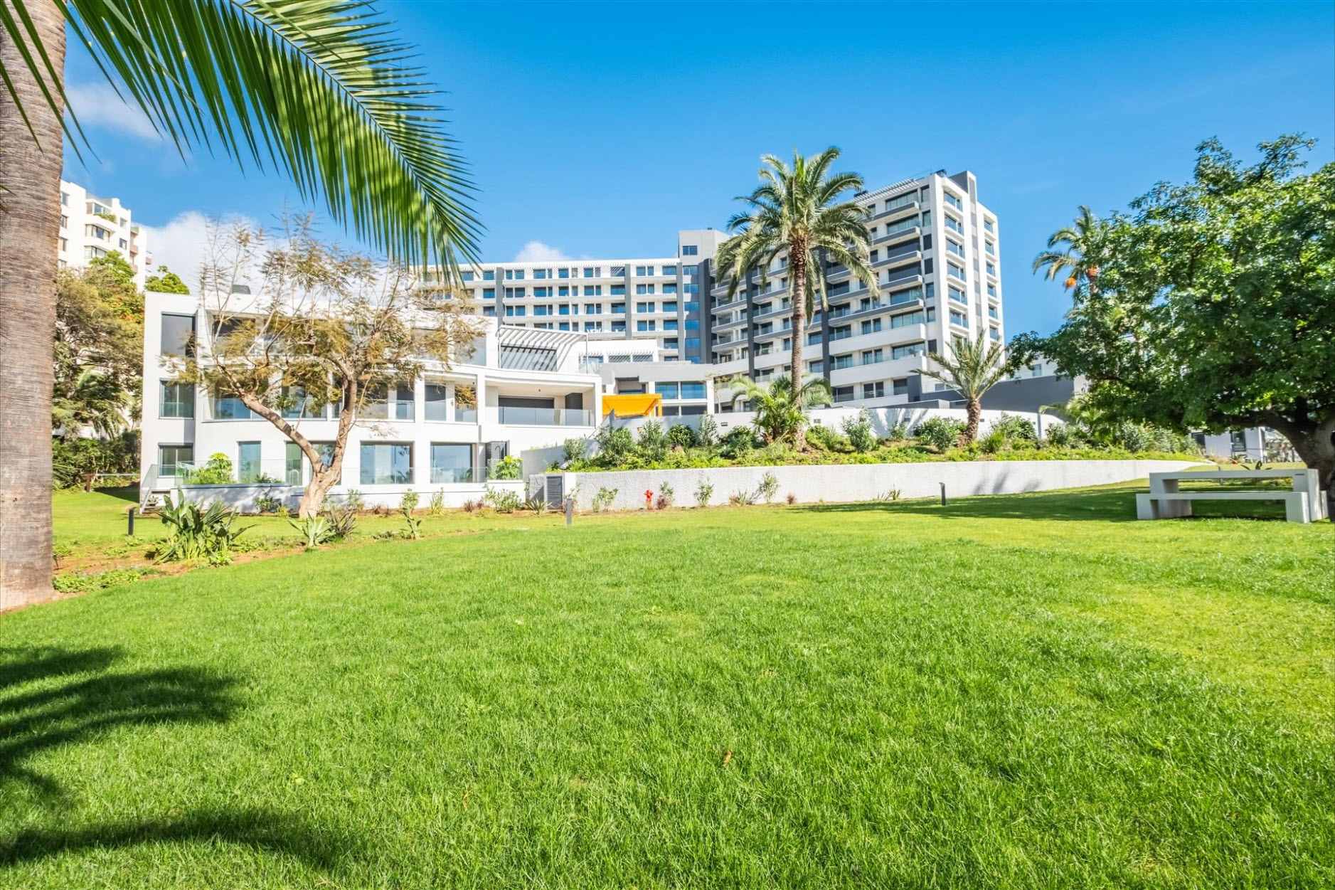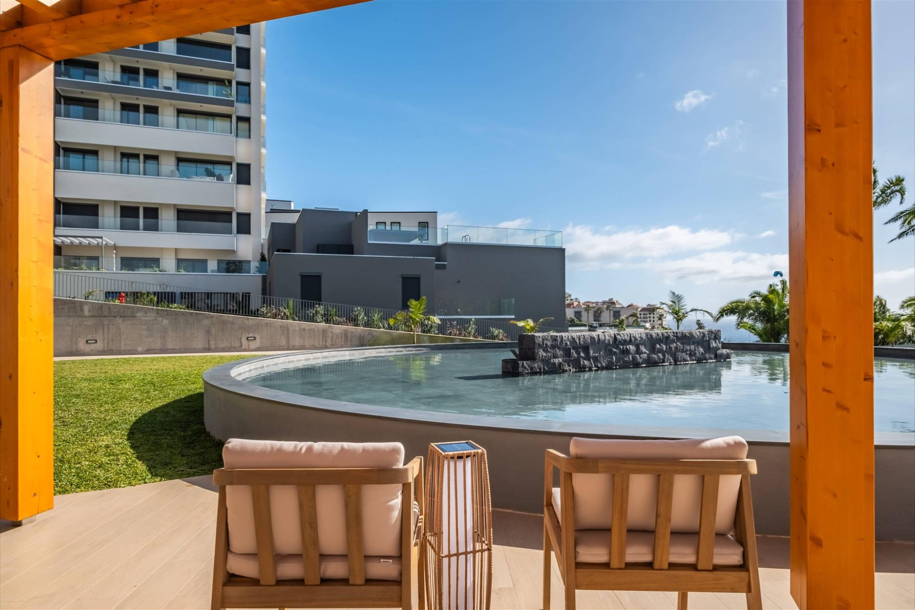 Die offene Küche verbindet sich harmonisch mit dem großzügigen Wohnraum, der auf eine private Terrasse mit Holzdeck und eigenem Pool führt. Der Zugang durch den begrünten Innenhof verleiht dem Zuhause eine besondere Frische und Eleganz. Die luxuriöse Wohnanlage bietet einen Infinity-Pool, Kinderpool, Fitnessraum, Gemeinschaftsräume, Besucherparkplätze sowie eine gepflegte Gartenlandschaft auf 7000 m². Ein exklusiver Aufzug führt direkt zum Strand Praia Formosa. Die Nähe zum Forum Madeira Shoppingcenter, öffentlichen Verkehrsmitteln und dem Lido-Touristenviertel macht diese Immobilie zu einer unvergleichlichen Gelegenheit für höchste Ansprüche.