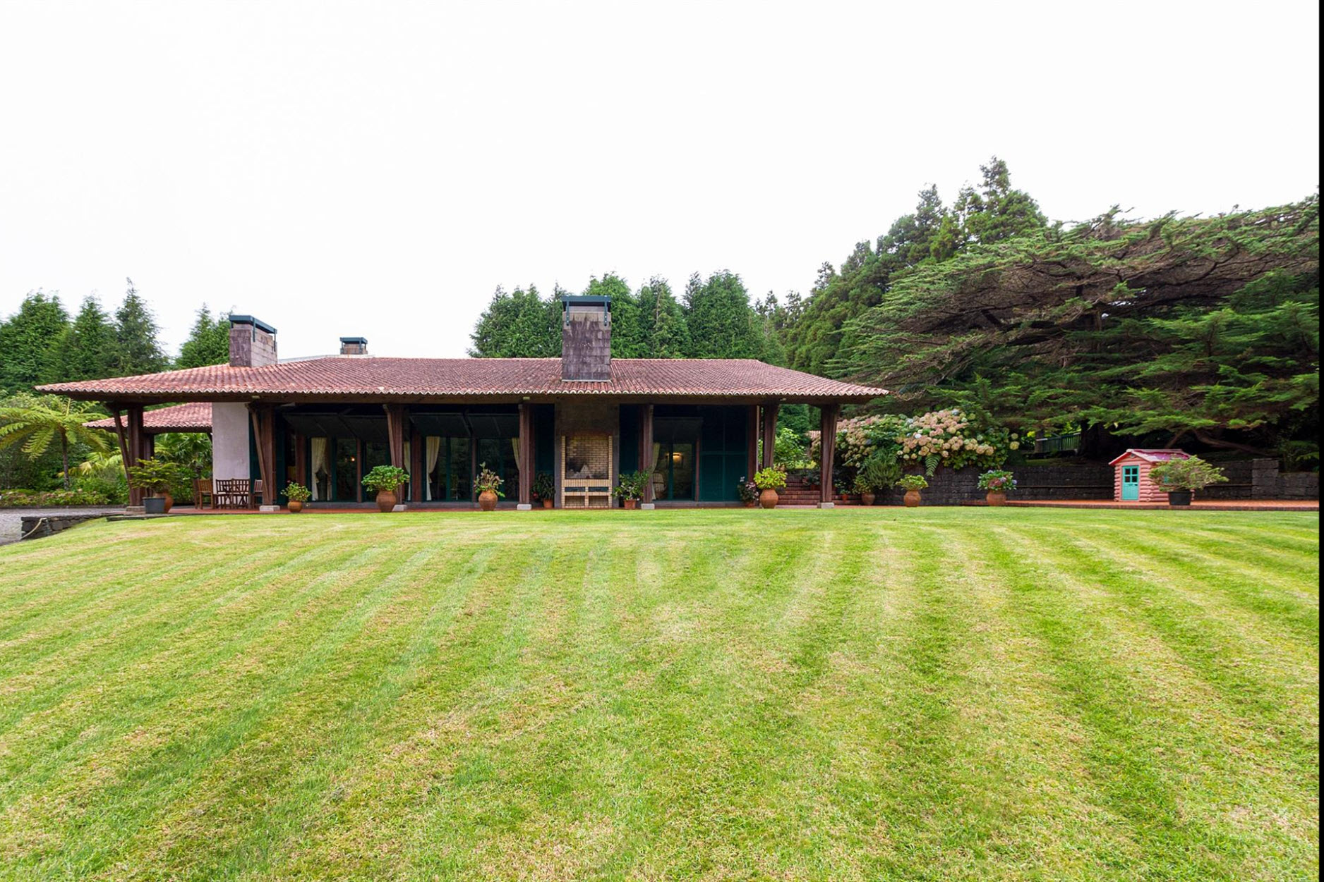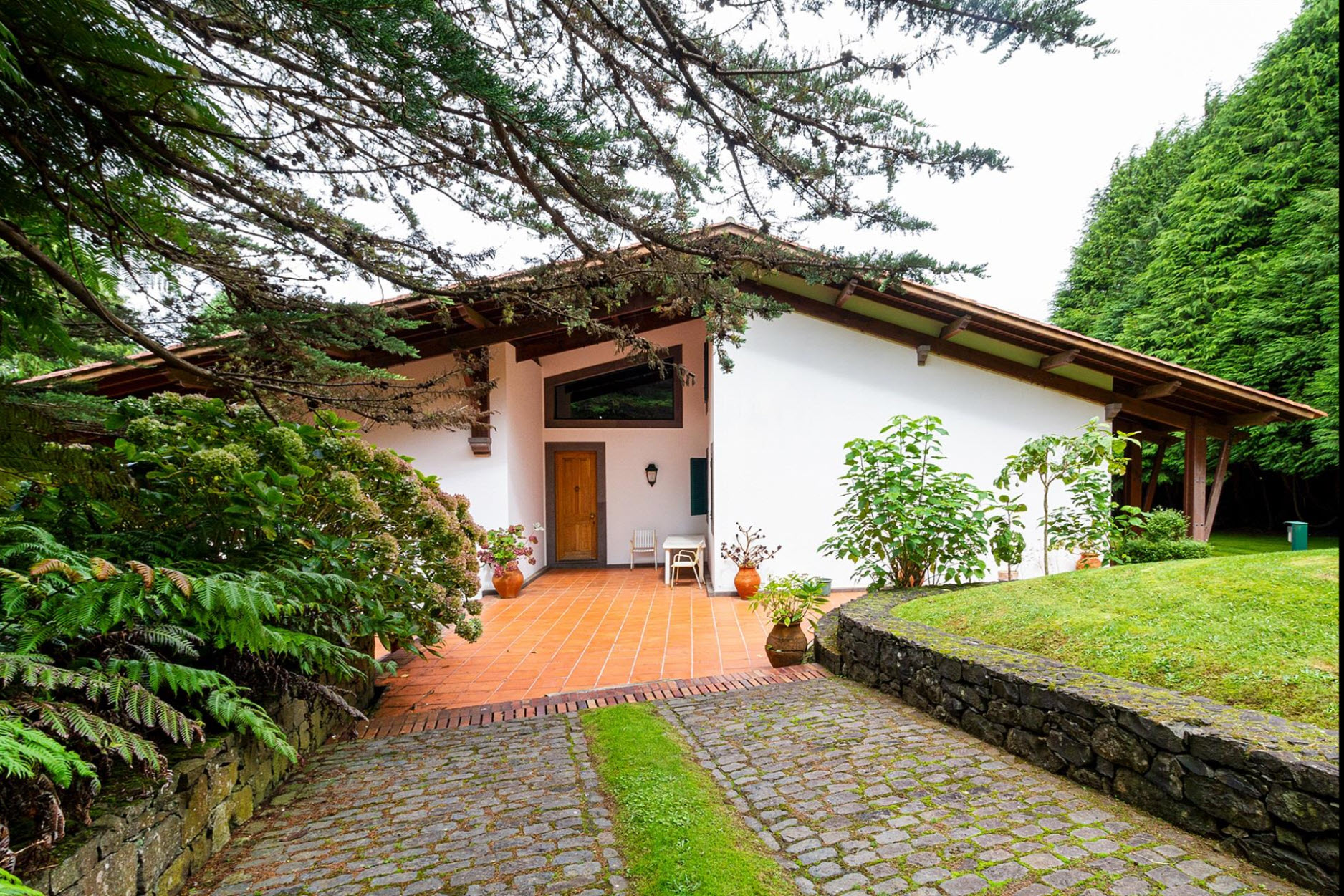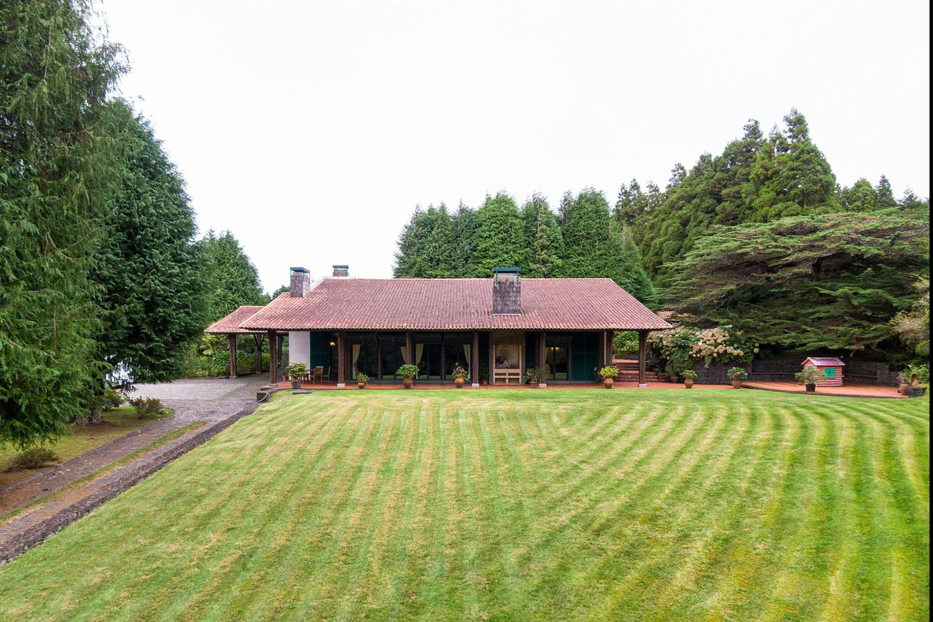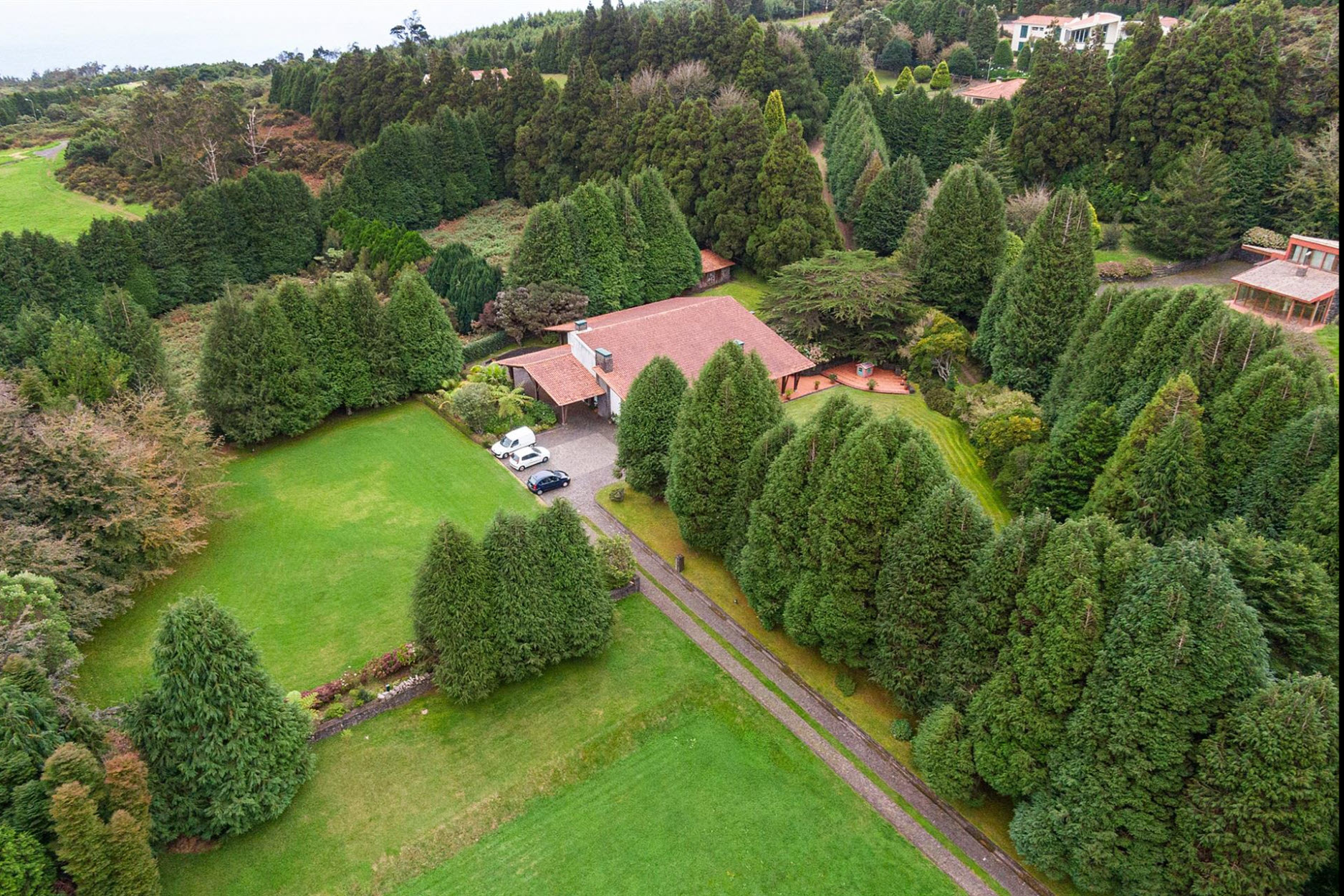 Diese außergewöhnliche Villa liegt auf einem beeindruckenden Grundstück von ca. 11.000 m² und grenzt direkt an den renommierten Santo da Serra Golf Club. Nur sechs Minuten vom Flughafen entfernt, bietet dieses Anwesen eine perfekte Kombination aus Privatsphäre, Natur und gehobenem Wohnkomfort.Das Haus erstreckt sich über zwei Etagen: Im Erdgeschoss befinden sich eine einladende Eingangshalle, eine voll ausgestattete Küche, ein Gäste-WC, eine Waschküche sowie ein großzügiger Wohn- und Essbereich mit Kamin und einer eleganten Basaltsteinwand. Die obere Etage beherbergt vier Schlafzimmer, von denen zwei über ein eigenes Bad verfügen, sowie ein weiteres Badezimmer für die übrigen Zimmer.