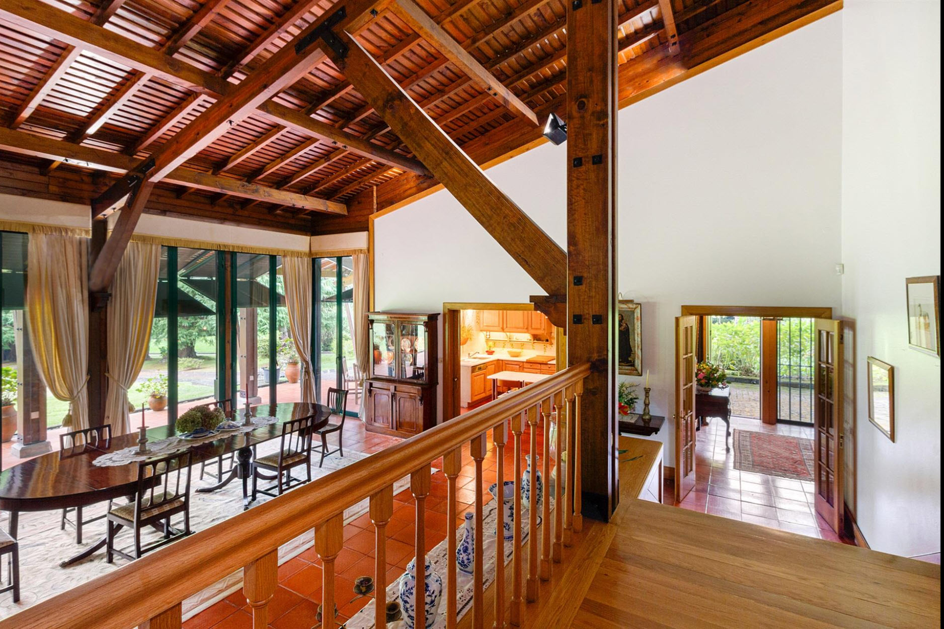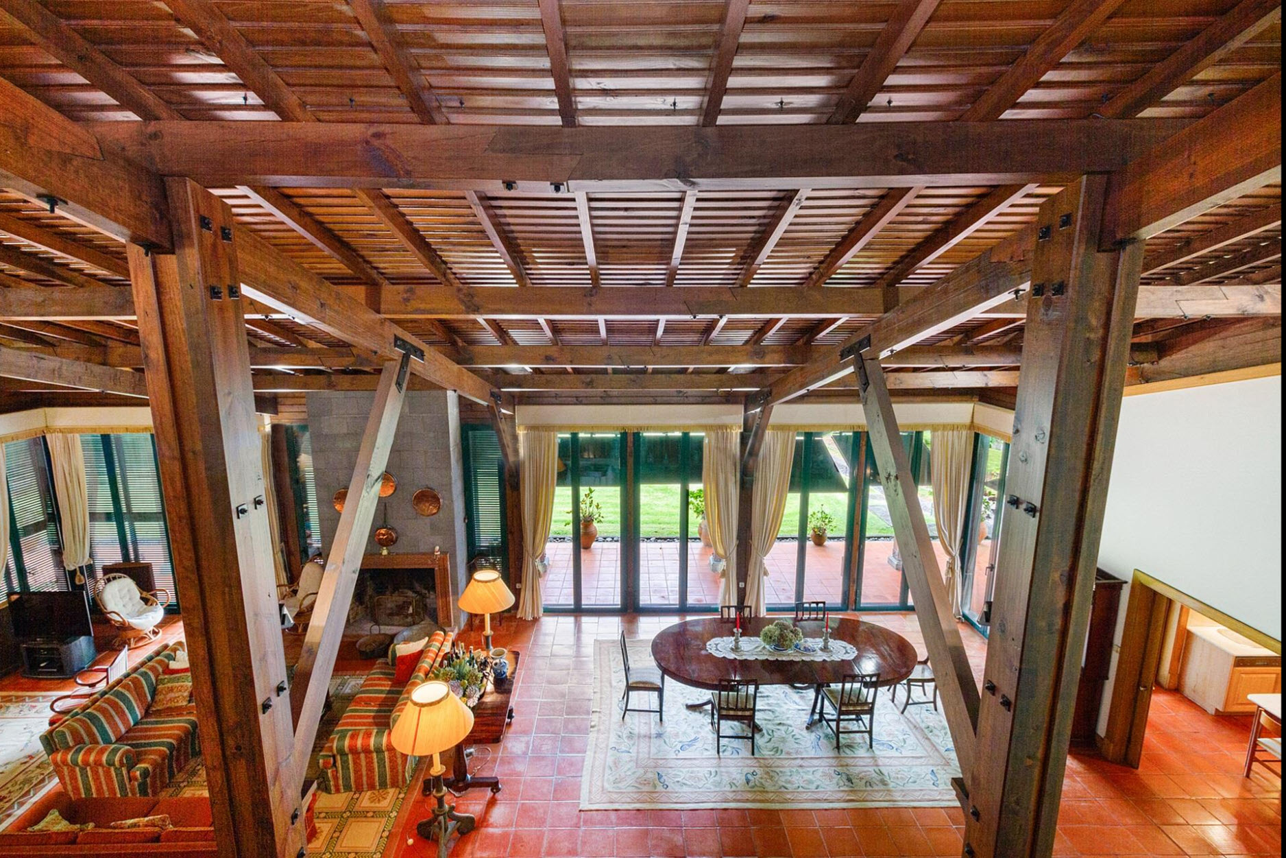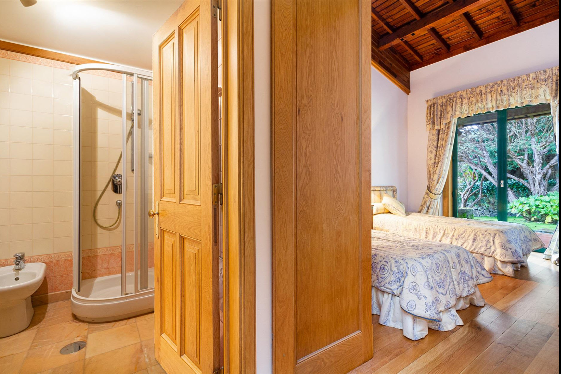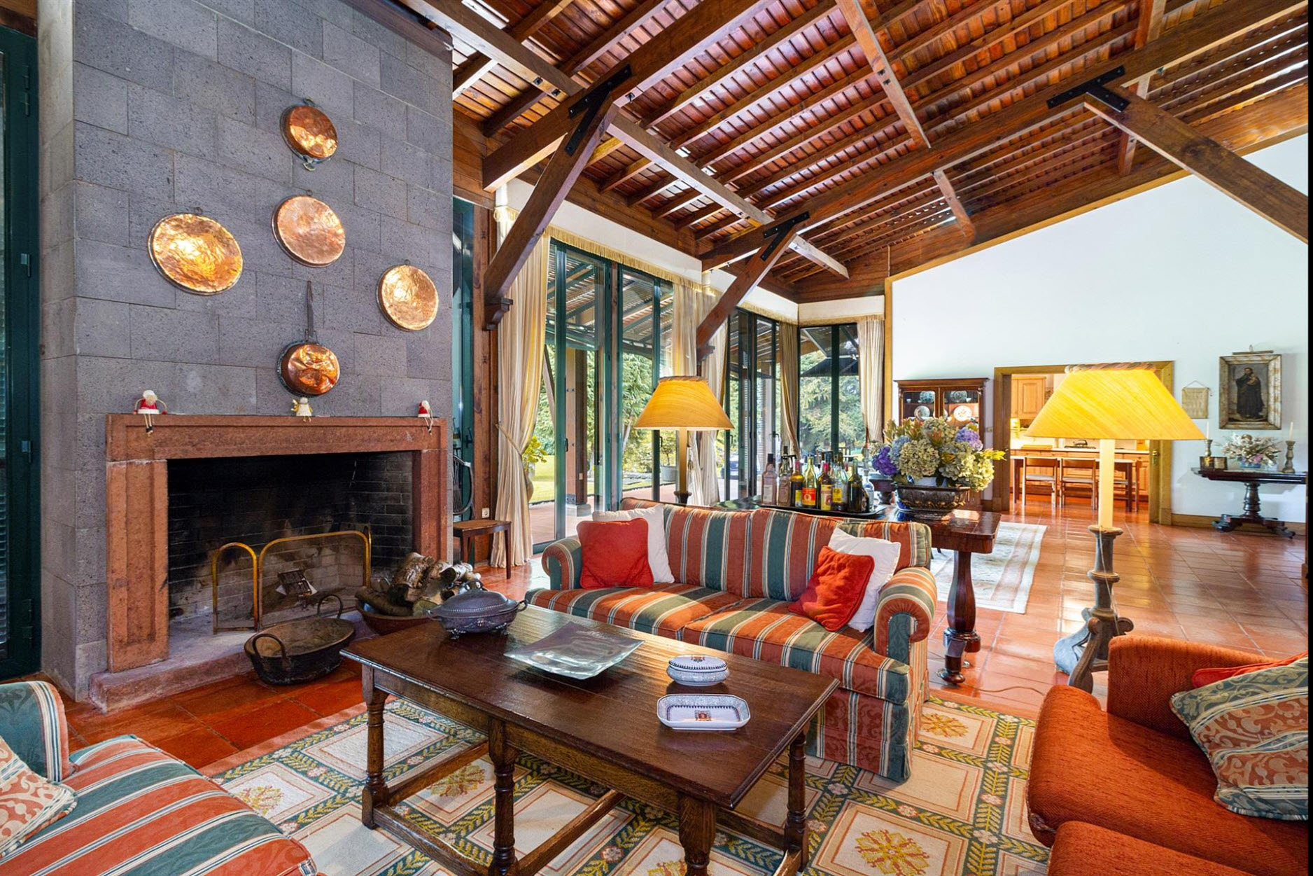 Diese außergewöhnliche Villa liegt auf einem beeindruckenden Grundstück von ca. 11.000 m² und grenzt direkt an den renommierten Santo da Serra Golf Club. Nur sechs Minuten vom Flughafen entfernt, bietet dieses Anwesen eine perfekte Kombination aus Privatsphäre, Natur und gehobenem Wohnkomfort.Das Haus erstreckt sich über zwei Etagen: Im Erdgeschoss befinden sich eine einladende Eingangshalle, eine voll ausgestattete Küche, ein Gäste-WC, eine Waschküche sowie ein großzügiger Wohn- und Essbereich mit Kamin und einer eleganten Basaltsteinwand. Die obere Etage beherbergt vier Schlafzimmer, von denen zwei über ein eigenes Bad verfügen, sowie ein weiteres Badezimmer für die übrigen Zimmer.