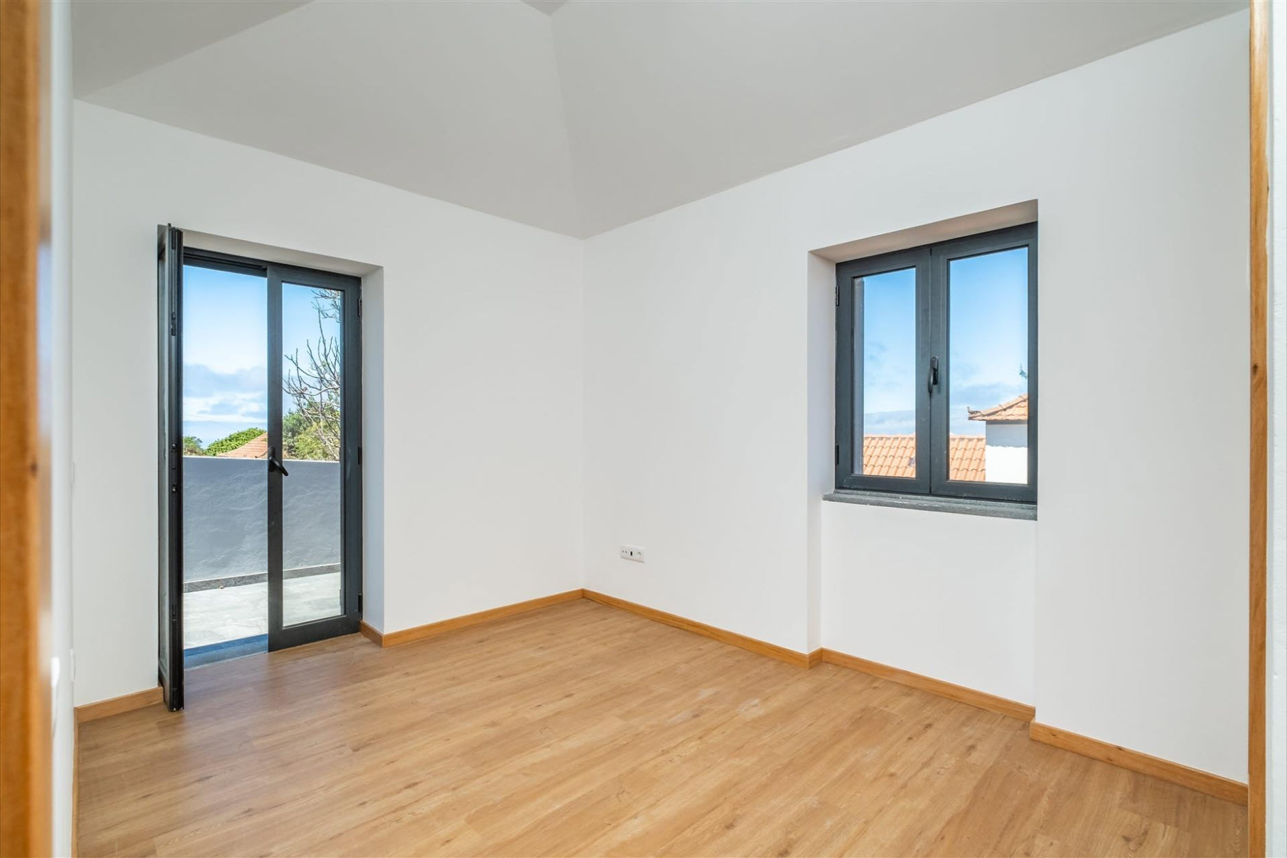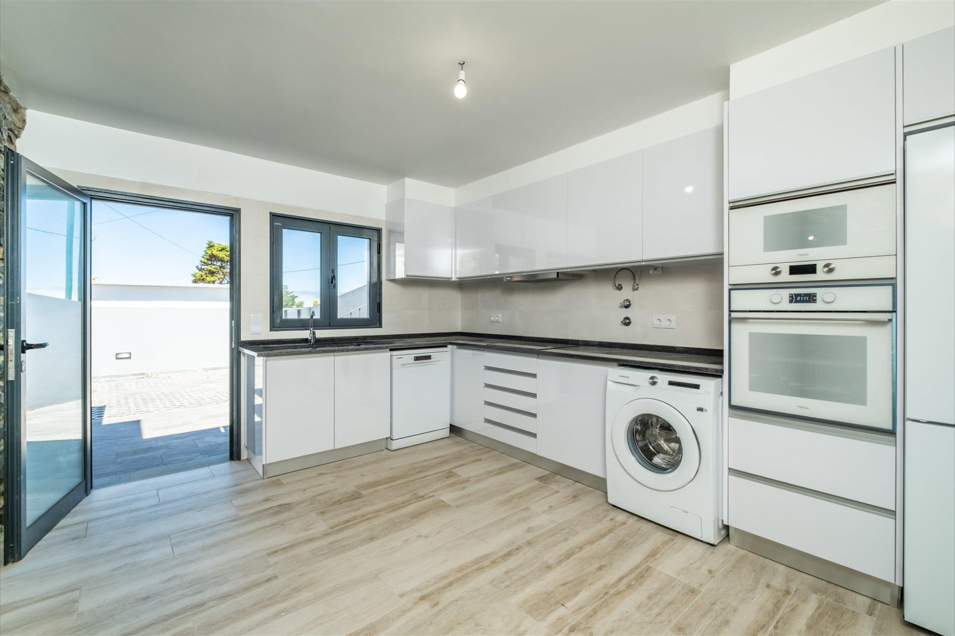 Die weißen Hochglanzschränke sorgen für maximales Tageslicht, während die direkte Anbindung an den Außenbereich das Genießen von Mahlzeiten im Freien besonders bequem macht. Eine überdachte Terrasse lädt zu geselligen Abenden ein. Im Obergeschoss befinden sich zwei helle Schlafzimmer, die sich ein großes Badezimmer teilen. Während eines der Zimmer Zugang zu einer privaten Terrasse mit wunderschönem Ausblick bietet, führt das andere direkt in den Garten. Zusätzlichen Komfort bietet der Außenbereich mit einem kleinen Servicebad, einem Abstellraum und Platz für bis zu drei Fahrzeuge auf dem Grundstück. Die Nähe zum Dorfzentrum und den wichtigsten Einrichtungen des täglichen Bedarfs macht diese Villa zu einer exzellenten Investition – sei es als privates Ferienhaus oder lukrative Vermietungsoption.
