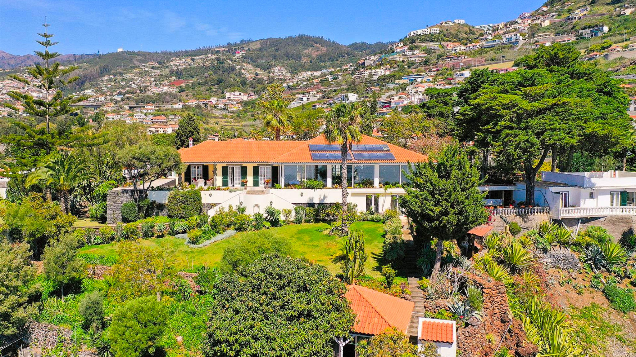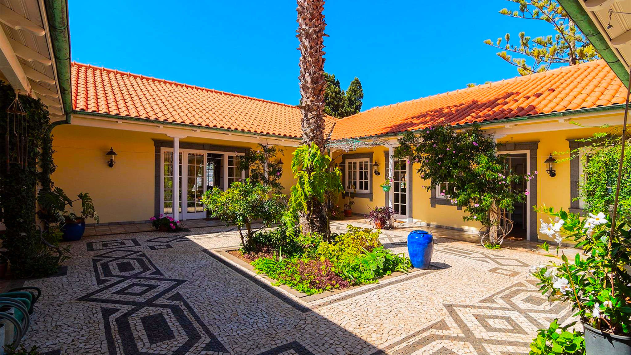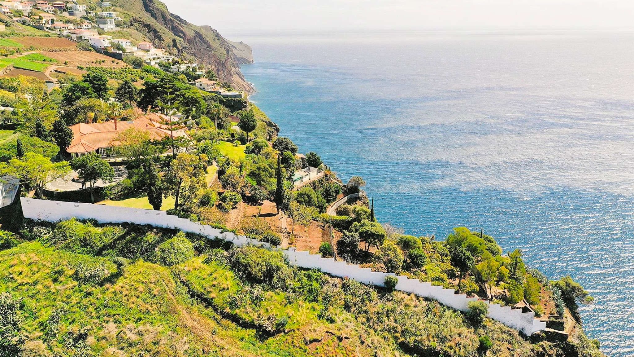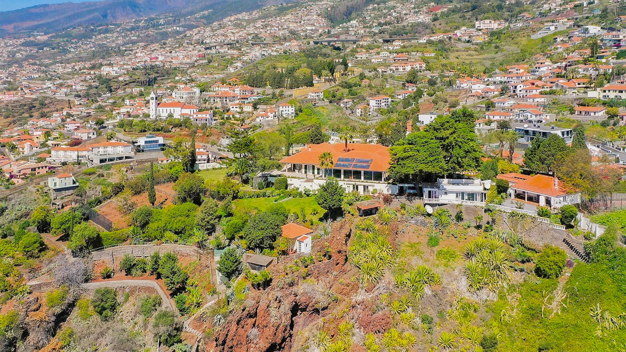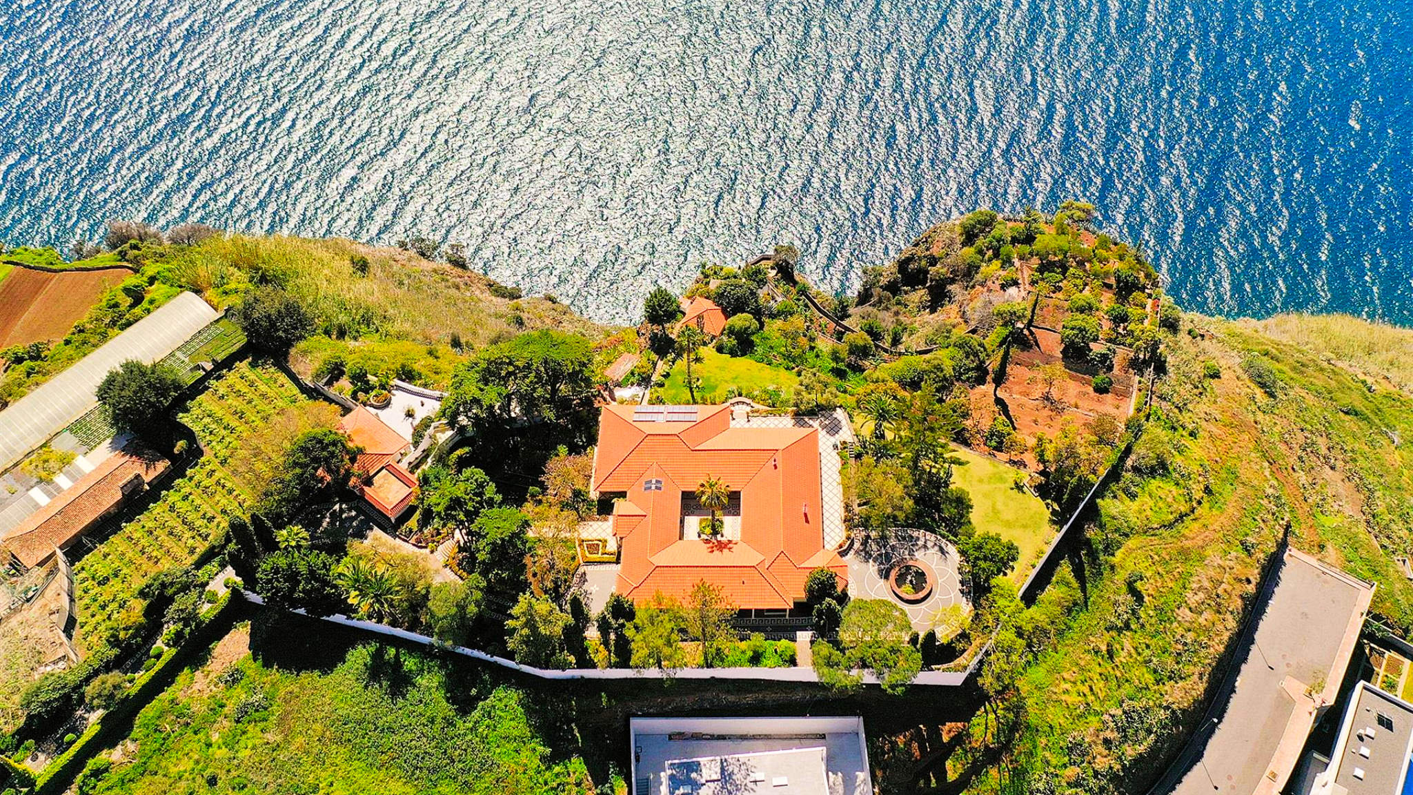 This incredible villa in a unique location on a cliff-top plot on the outskirts of Funchal is set on a two-hectare plot. From here you can enjoy 360-degree views of the bay and harbour, over the sea and the mountains from sunrise to sunset. At the same time, the size and location of the property guarantee maximum privacy and individuality. The property was built to the highest quality standards with impeccable craftsmanship and amazing refinements. The villa welcomes the visitor with an impressive entrance hall leading to a beautiful courtyard as the centre of the complex.