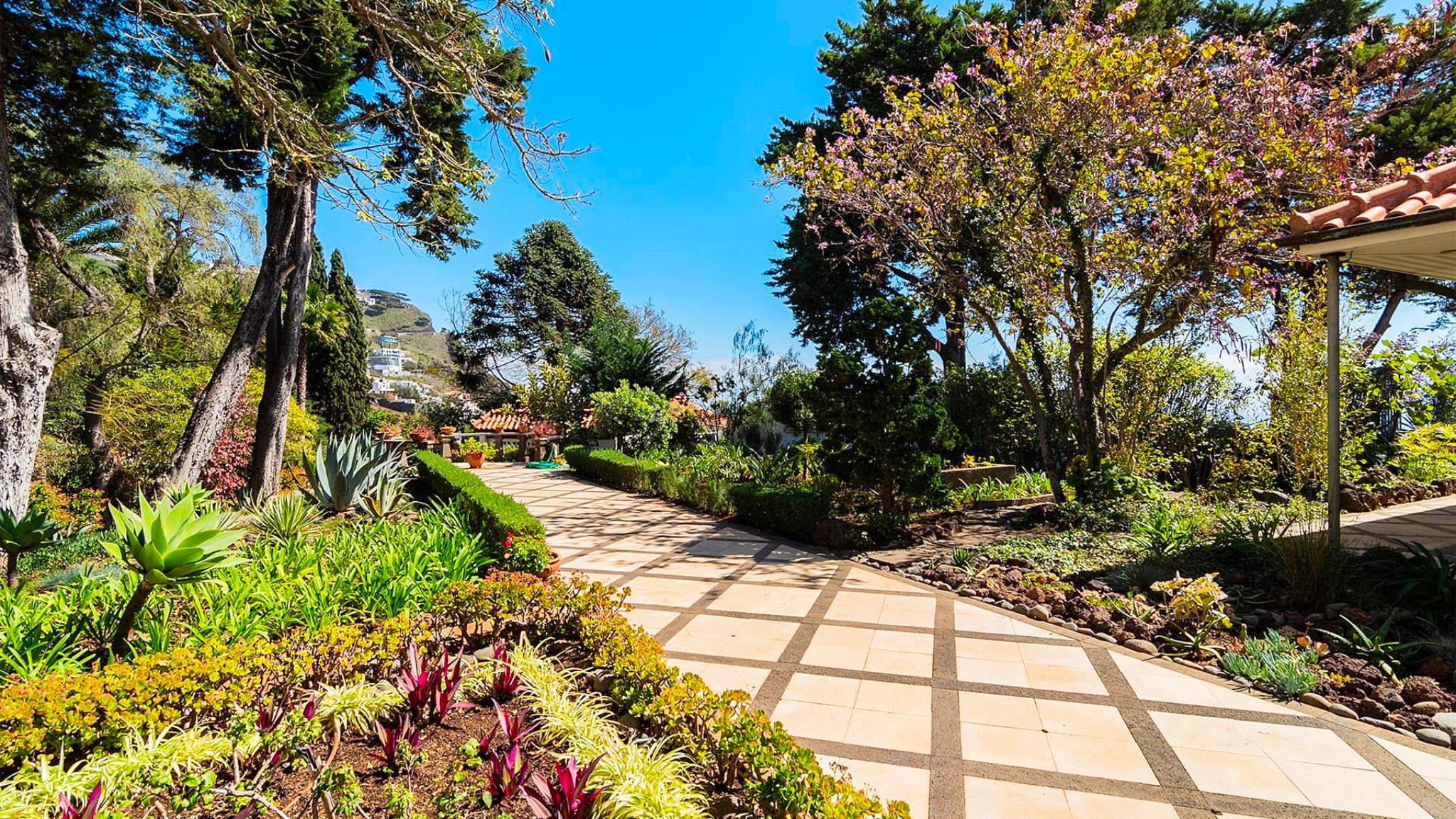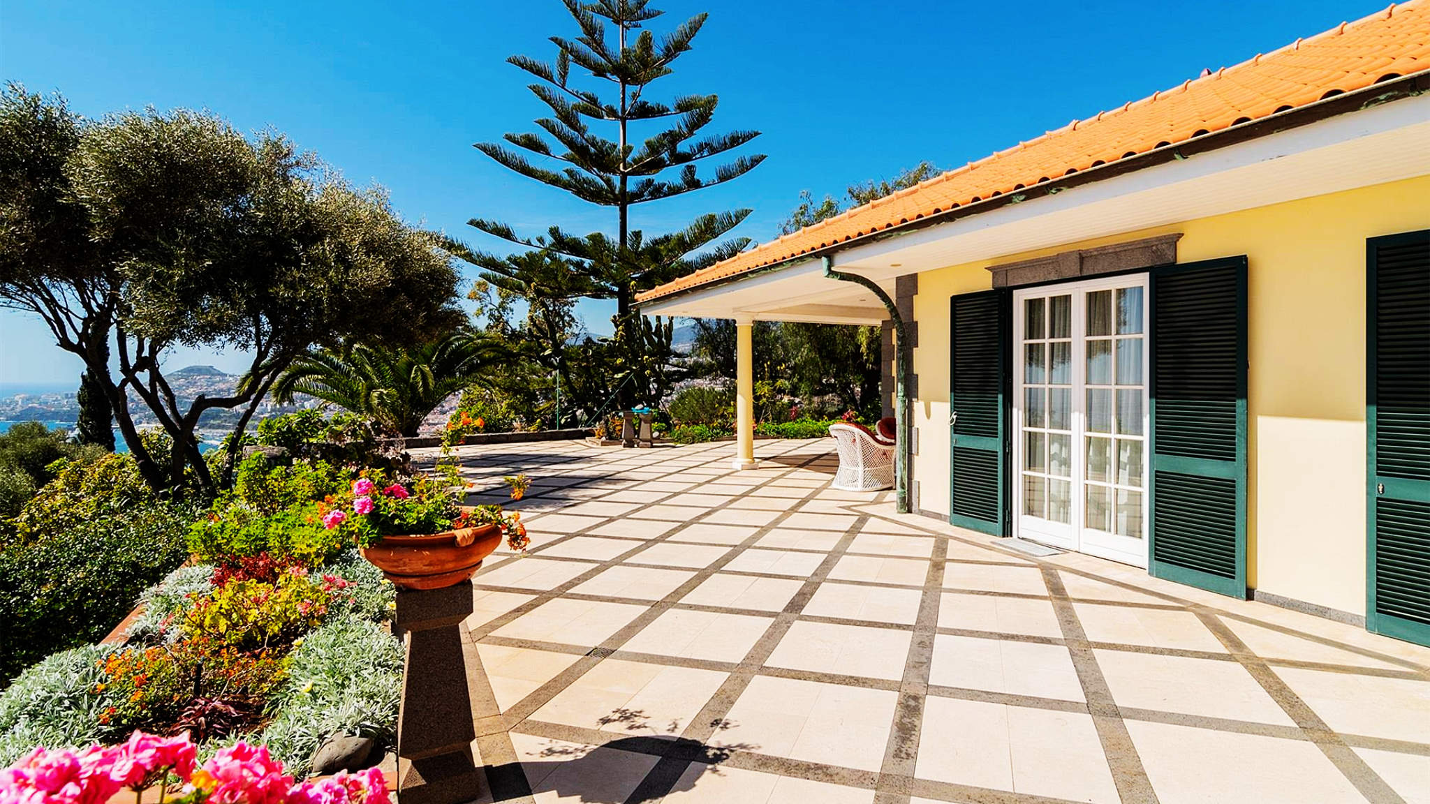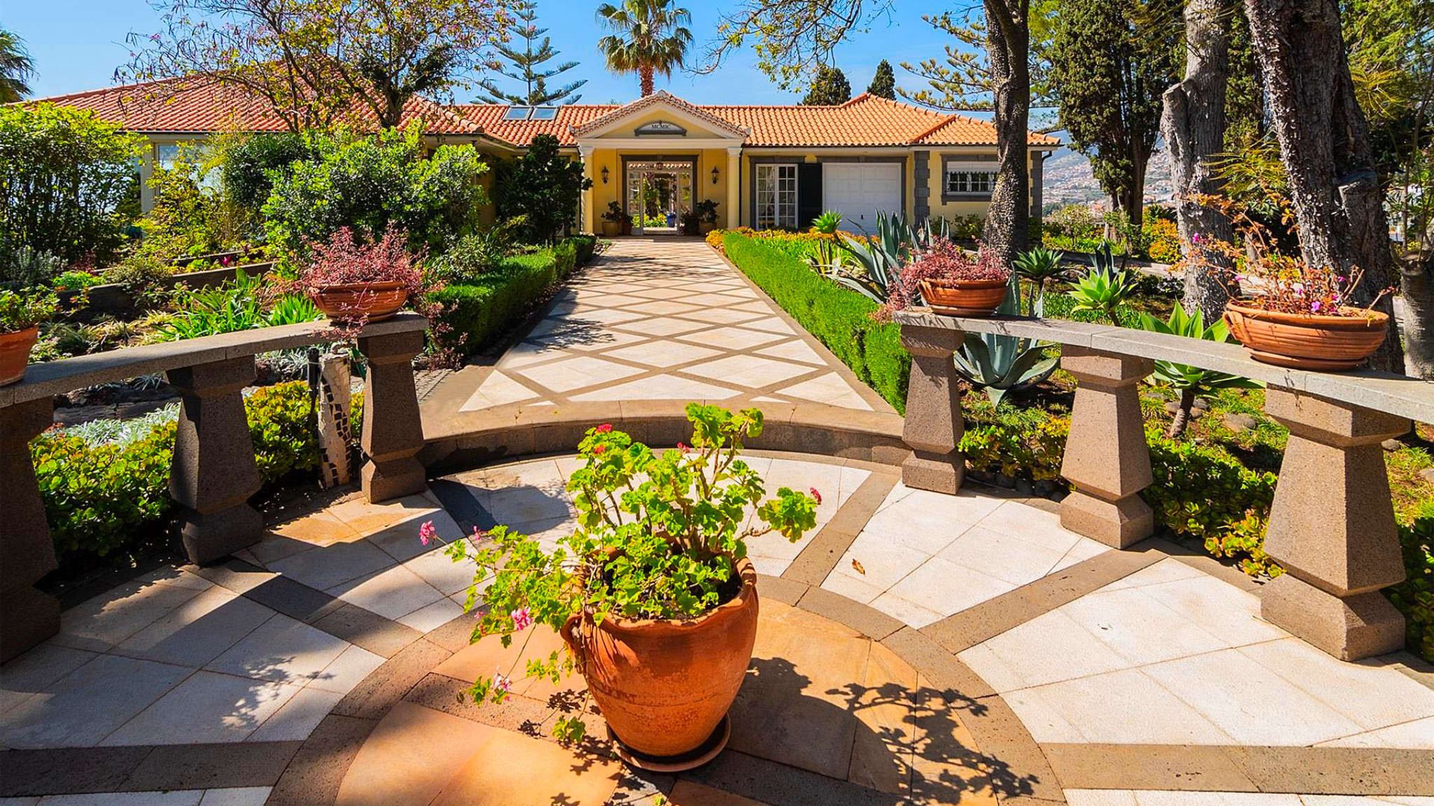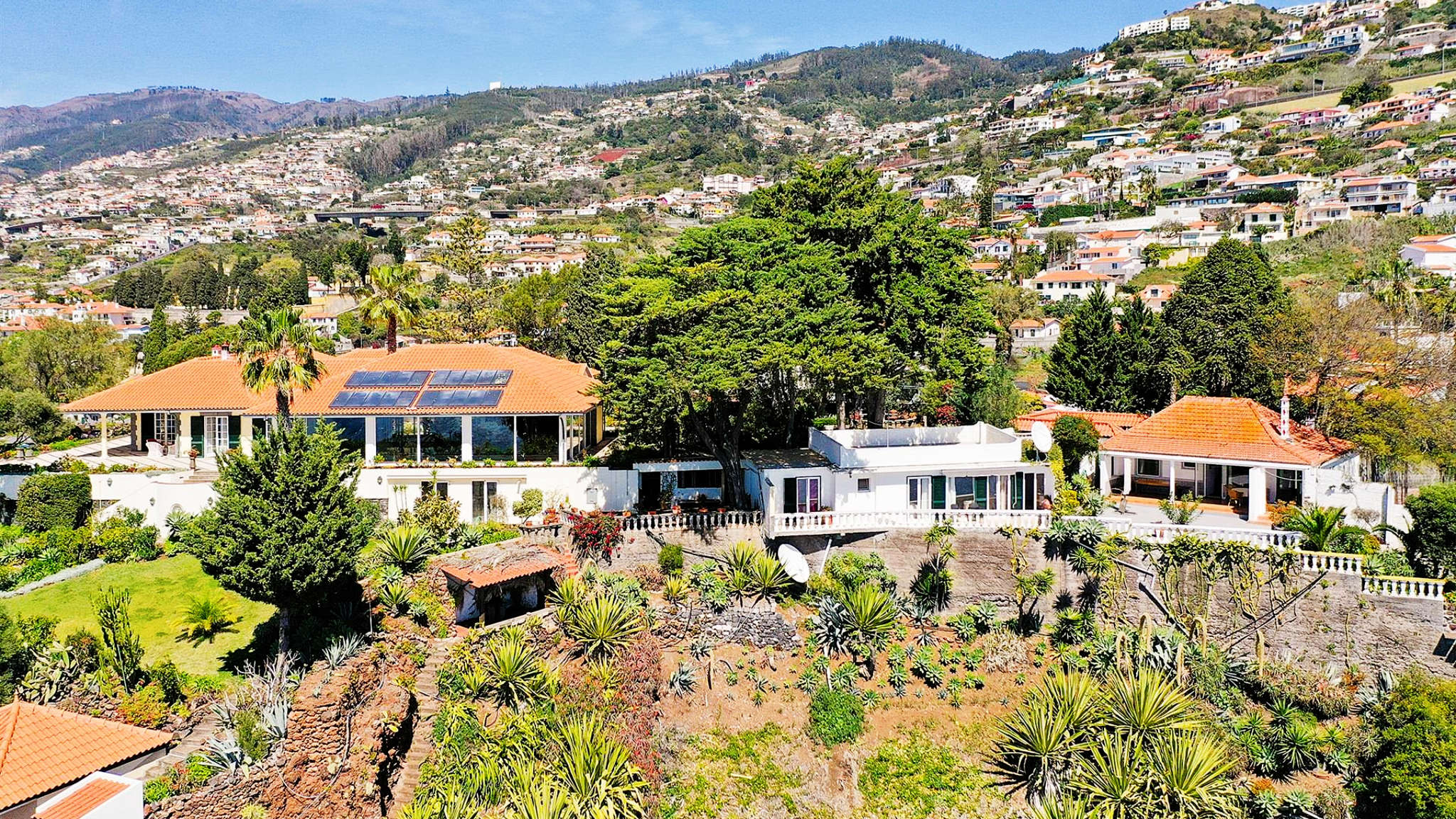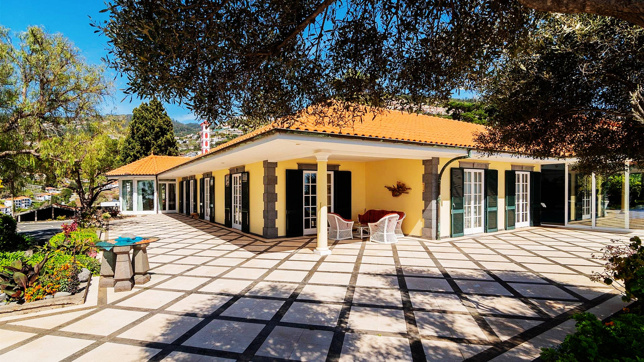 This incredible villa in a unique location on a cliff-top plot on the outskirts of Funchal is set on a two-hectare plot. From here you can enjoy 360-degree views of the bay and harbour, over the sea and the mountains from sunrise to sunset. At the same time, the size and location of the property guarantee maximum privacy and individuality. The property was built to the highest quality standards with impeccable craftsmanship and amazing refinements. The villa welcomes the visitor with an impressive entrance hall leading to a beautiful courtyard as the centre of the complex.