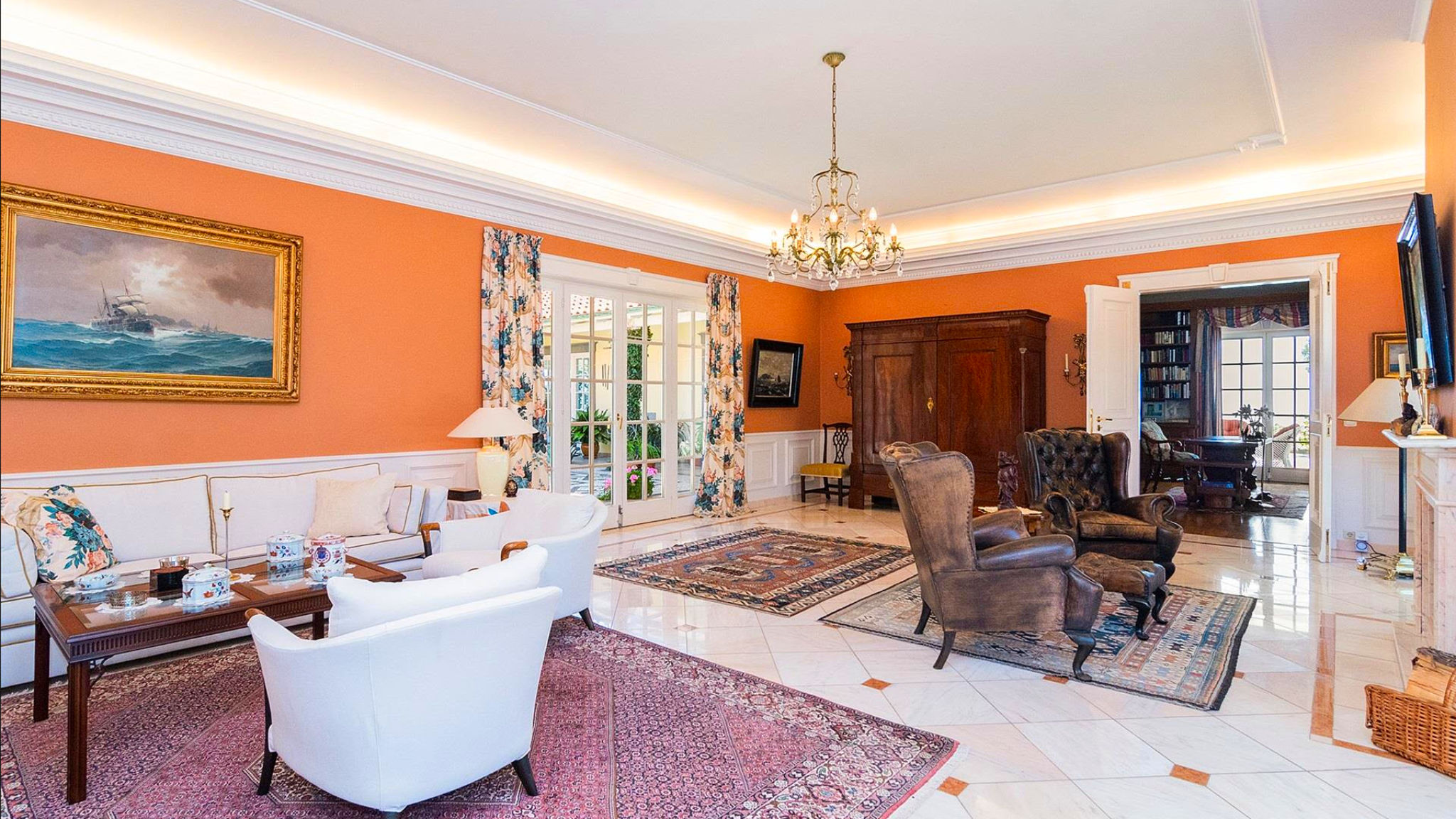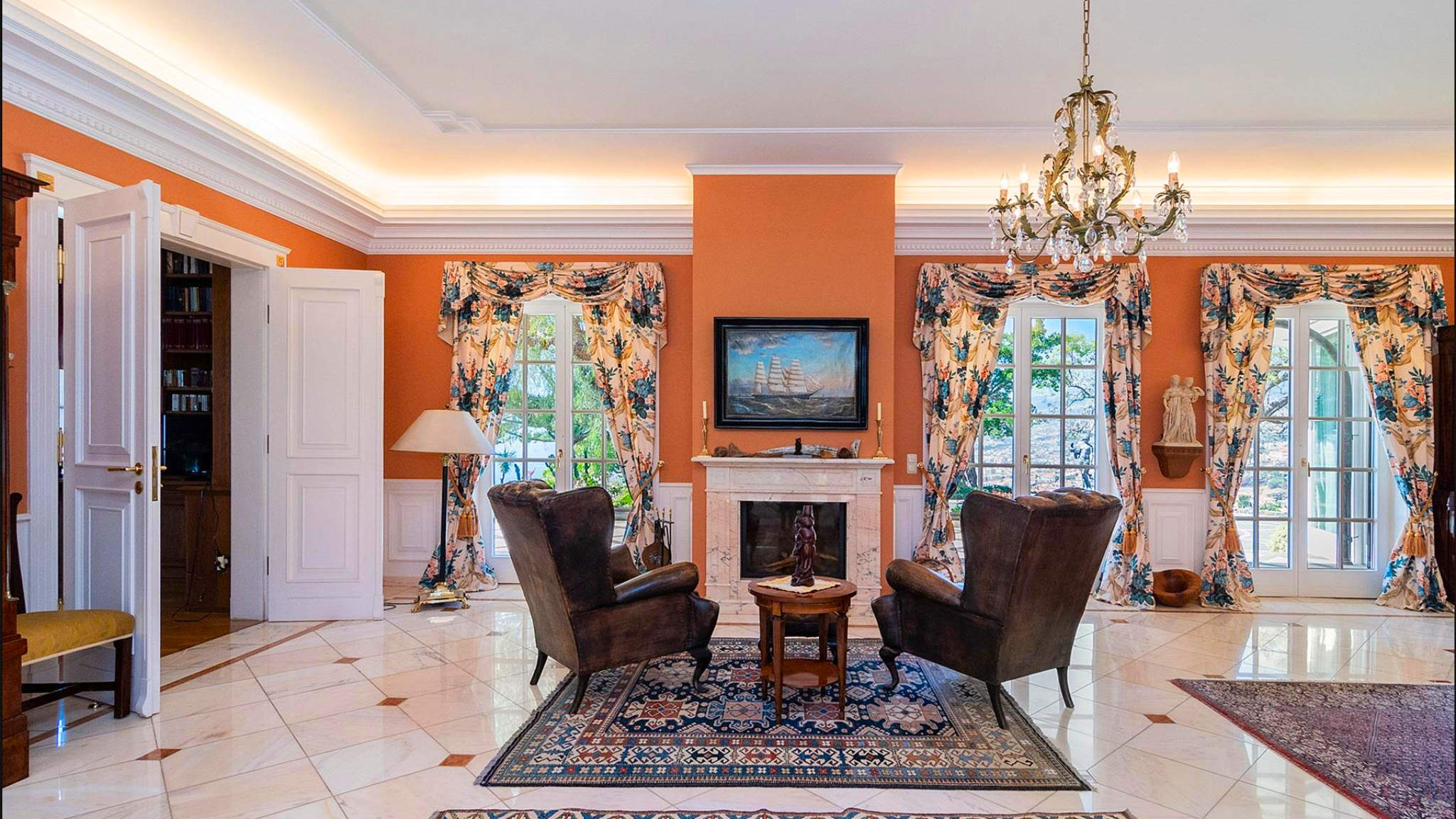 The large living room, library and dining room are furnished to a high standard with natural stone or wooden floors and two fireplaces. Floor-to-ceiling windows allow barrier-free access to the outdoor space. The custom kitchen offers a clean design and fulfils every chef's dream, with high-end appliances and exceptional attention to detail. Located in the main house, the master suite offers direct access to the covered swimming pool and living areas. The property has two further annexes, one with two additional bedrooms and the other as a studio with stunning sea views. The property is nestled in a wonderful and very well maintained park. The villa is probably the most exceptional property currently on the market in Madeira.