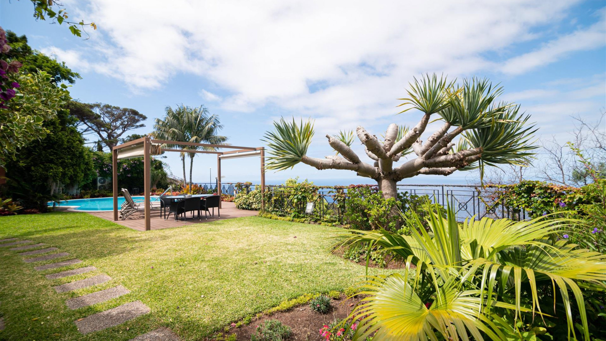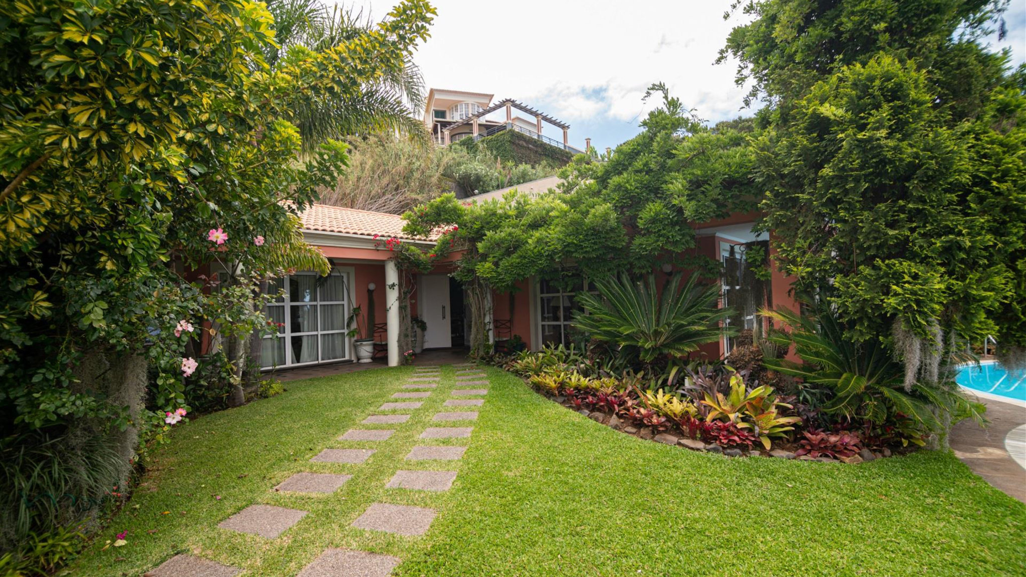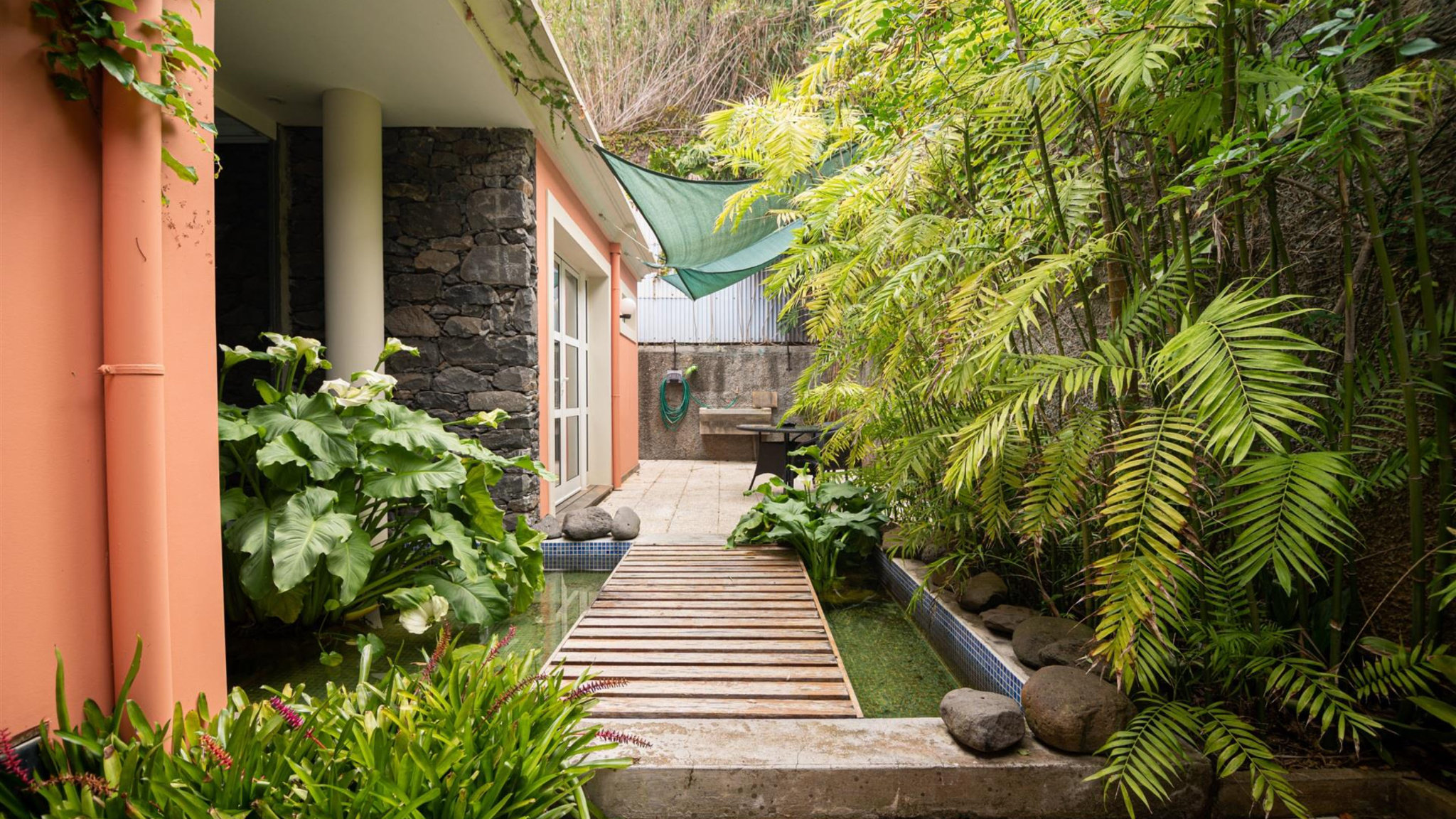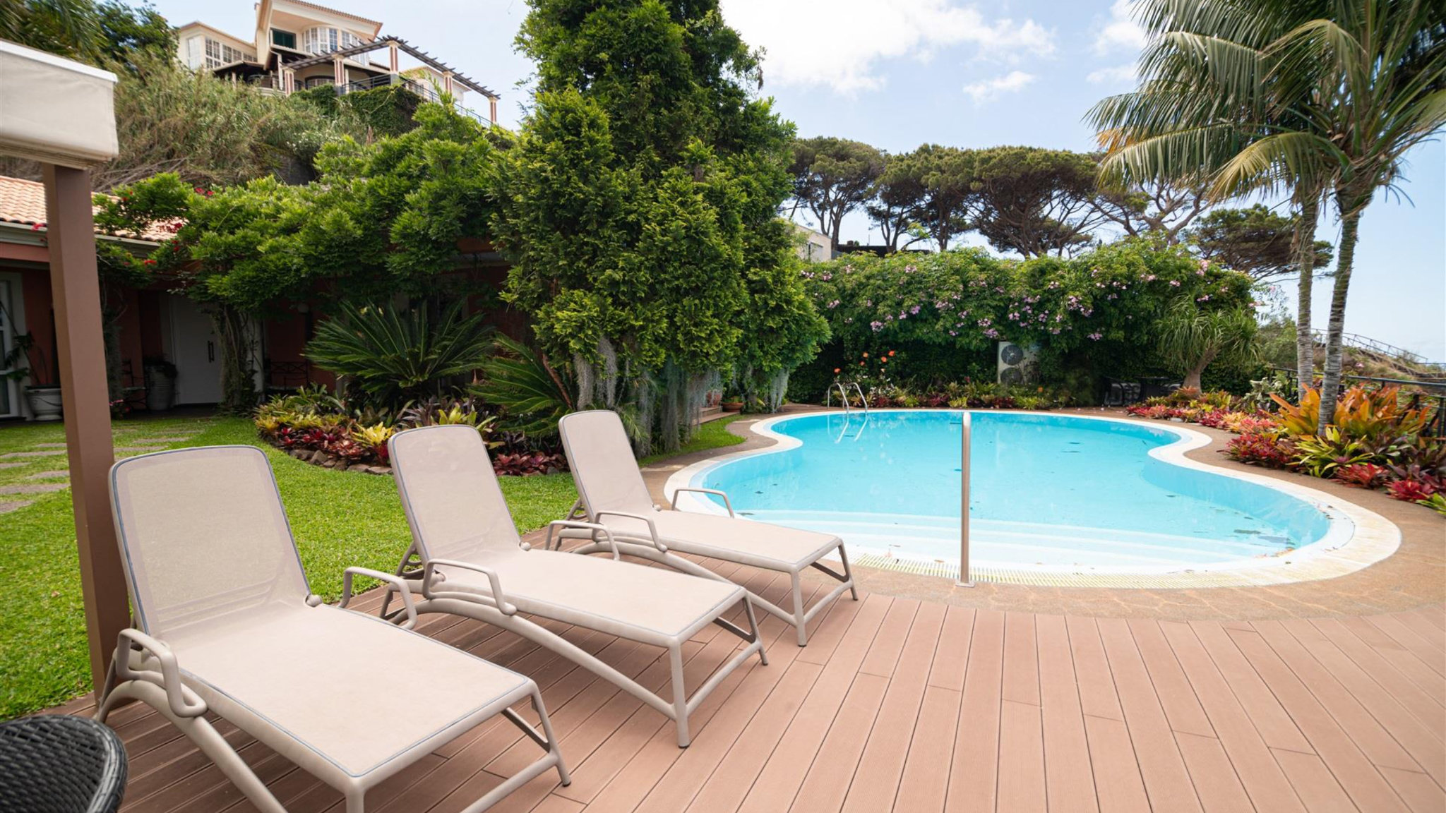 On this floor there is also a pantry, a laundry room, an office and a guest bathroom. In the private area on this floor is a small staff or guest suite with access to the garden. The sleeping area of the villa is on the upper floor, which consists of three suites with a large balcony. The highlight of the villa is the incredibly beautiful and well-kept garden area with a swimming pool and breathtaking views of the city. Here you will also find a barbecue area, a small pond, a kennel and a greenhouse surrounded by exotic plants and trees. Although the villa is located in a quiet area, it is within easy reach of various amenities. It takes about 10 minutes by car to reach the centre of Funchal.
