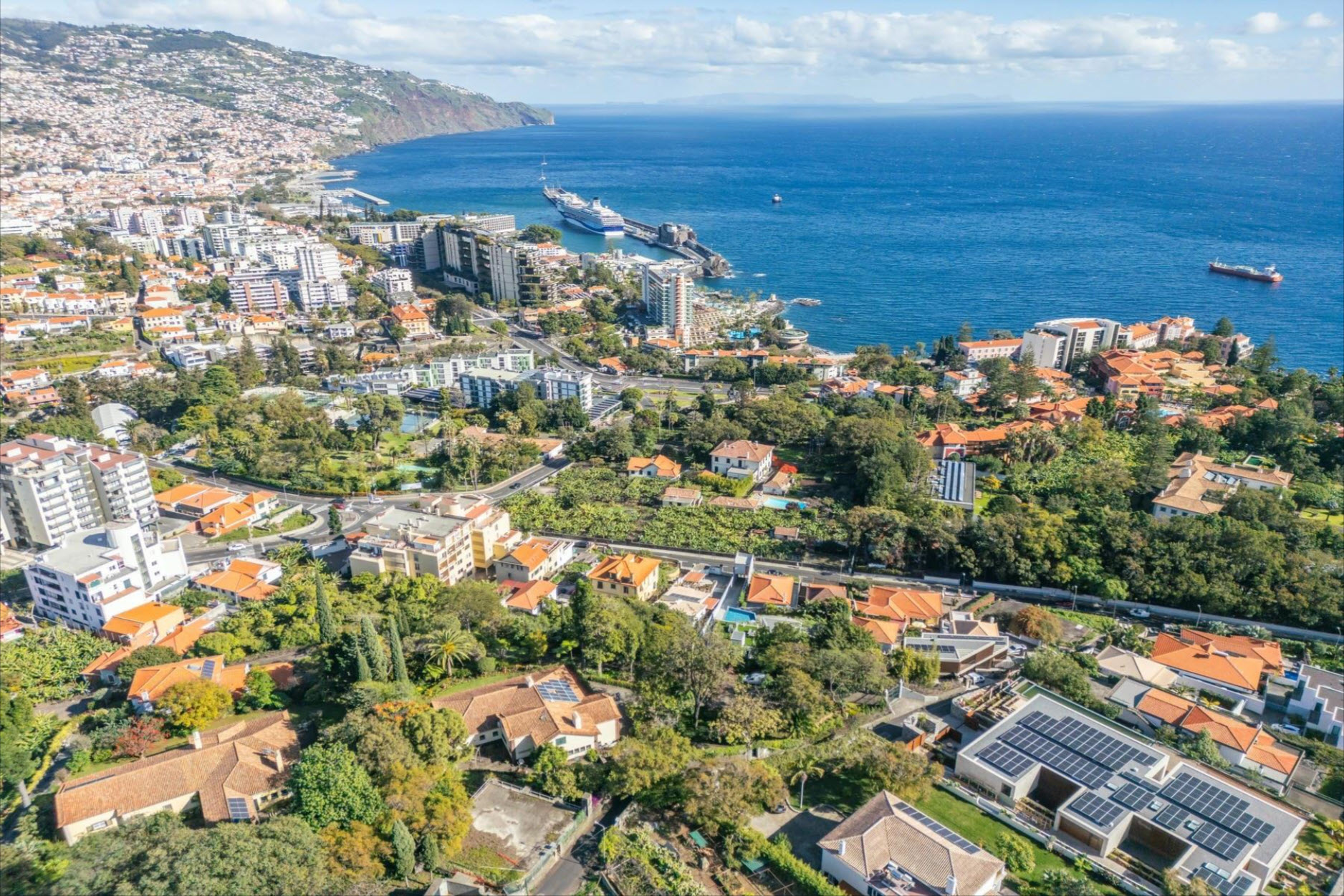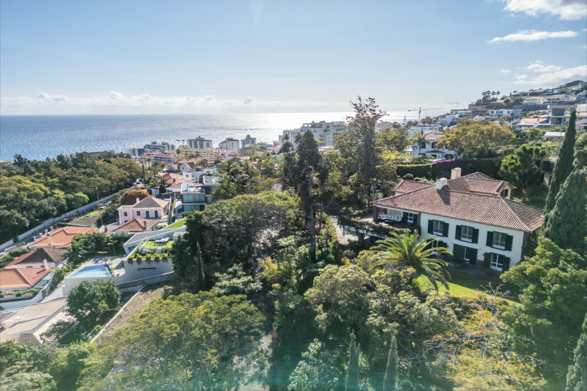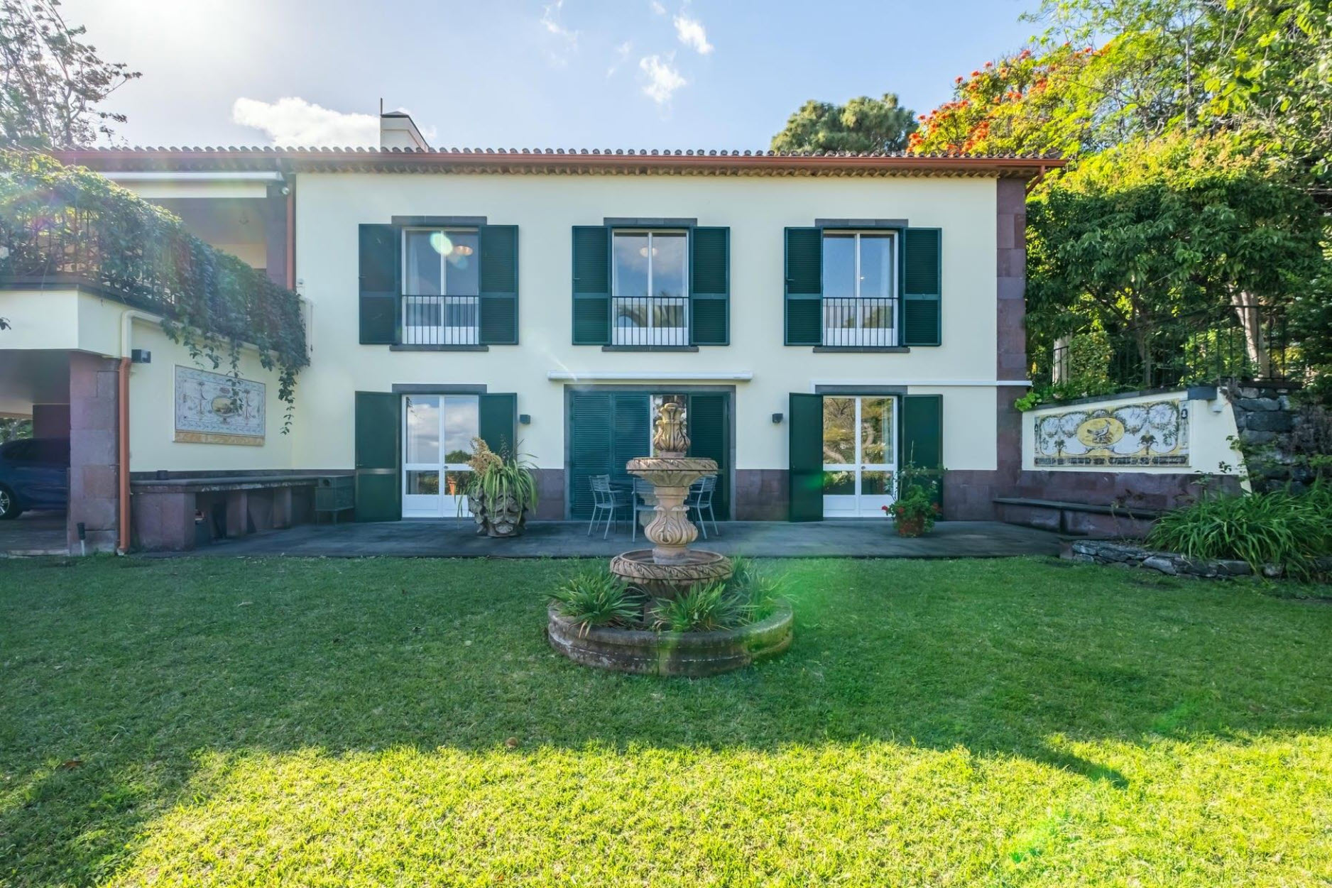 The fully equipped kitchen with a gas stove caters to culinary excellence. The park-like garden, adorned with century-old trees, a charming fountain, and a sun terrace, provides a serene retreat. From here, enjoy breathtaking views over Funchal Bay and the harbor. A rooftop photovoltaic system ensures sustainable energy, while air-conditioned bedrooms offer ultimate comfort. Set on an impressive 4,687 m² plot, this estate guarantees privacy and tranquility – a true oasis within the city. Two covered parking spaces are available. A rare opportunity to own an exceptional residence.