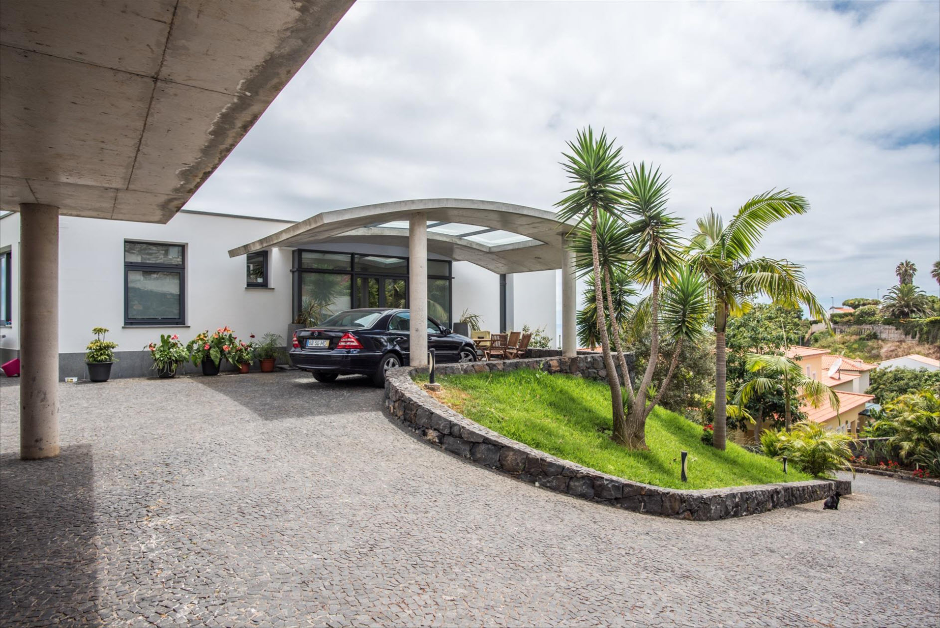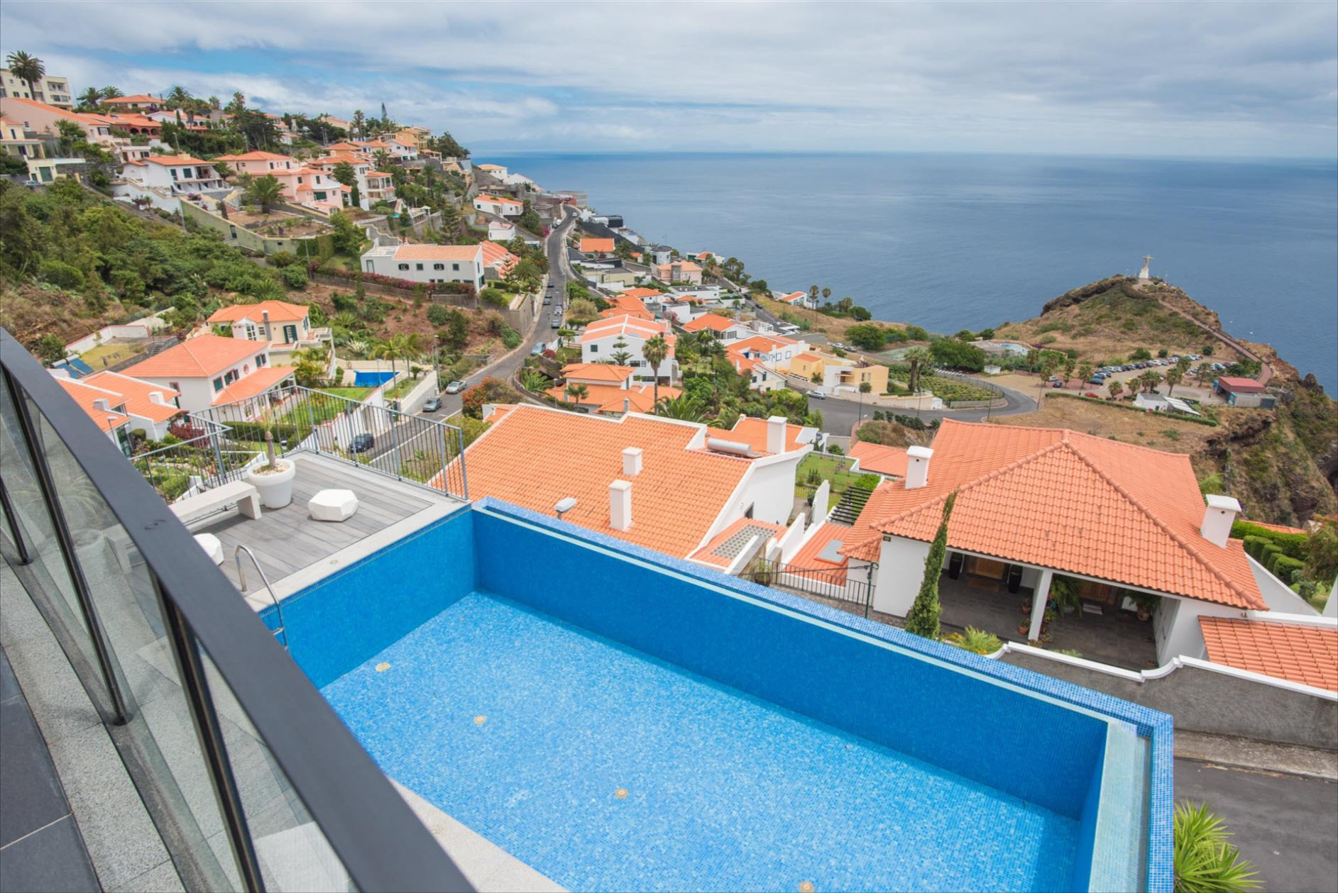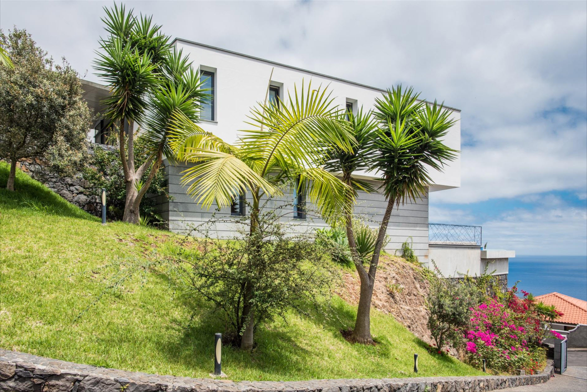 On the lower floor, you'll find another suite with a dressing room and a versatile multipurpose room, perfect as an office, gym, or home cinema. The outdoor area is a true highlight: A private pool invites you to relax, while the expansive terrace and landscaped gardens offer the perfect space to enjoy the sun and the spectacular views. The villa’s excellent sun exposure ensures natural light throughout the day. With three covered parking spaces and a prime location near the charming town of Santa Cruz, this property is a rare gem.