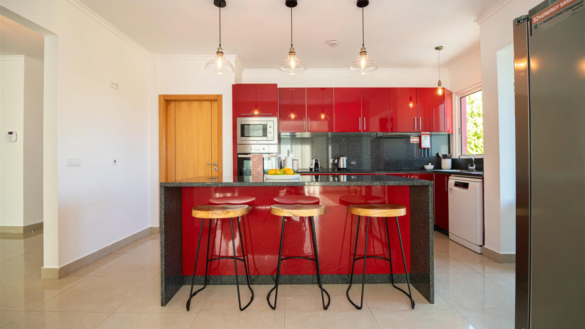 This lavishly appointed villa is located in a very quiet area with an almost peaceful atmosphere. The elegant design from the outside continues inside. The architectural style with high-quality materials skilfully combines modern and traditional elements harmoniously. Upon entering the house, one finds spacious and very bright rooms. The spacious living room with floor-to-ceiling windows offers a beautiful view and access to a large balcony where you can enjoy the mild climate all year round. In the same open space, there is also a modern kitchen equipped with the latest appliances and plenty of storage space. The central kitchen bar provides additional space for food preparation and is also the perfect place to enjoy moments with family or friends. Adjacent to this area is the dining room. On the same level are two bedrooms and an en suite, each with built-in wardrobes.