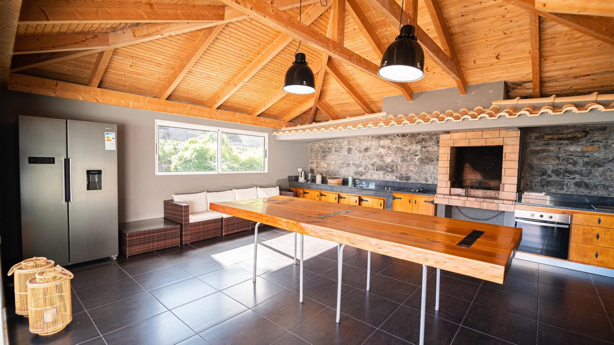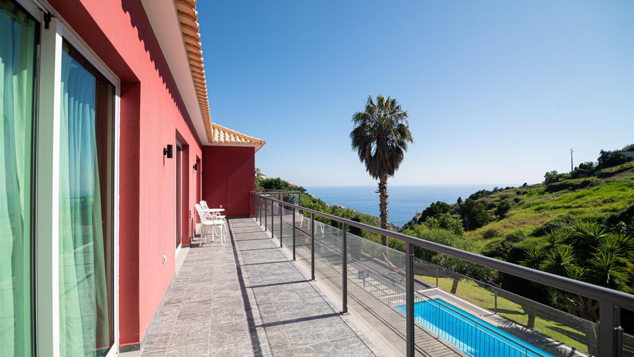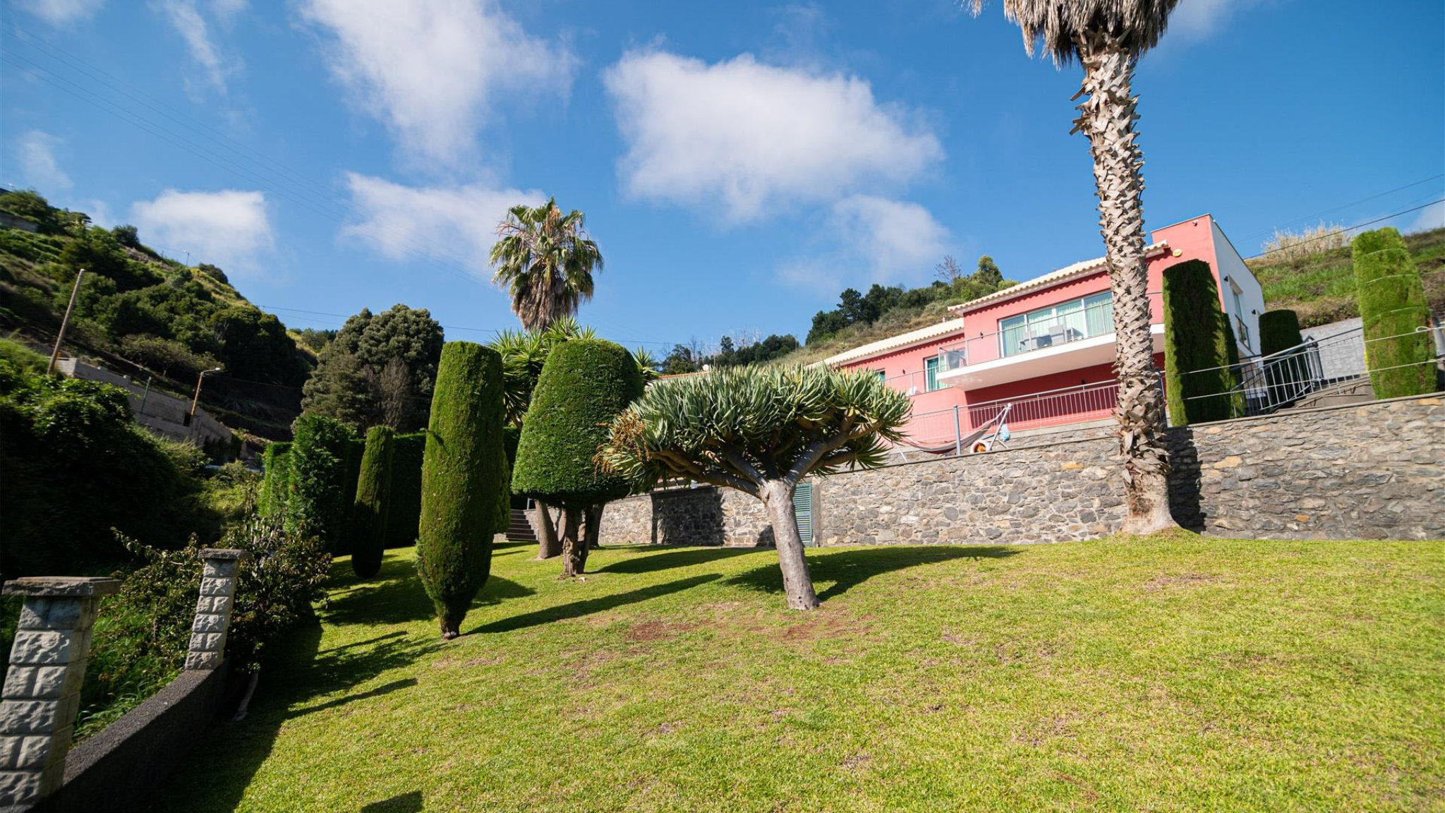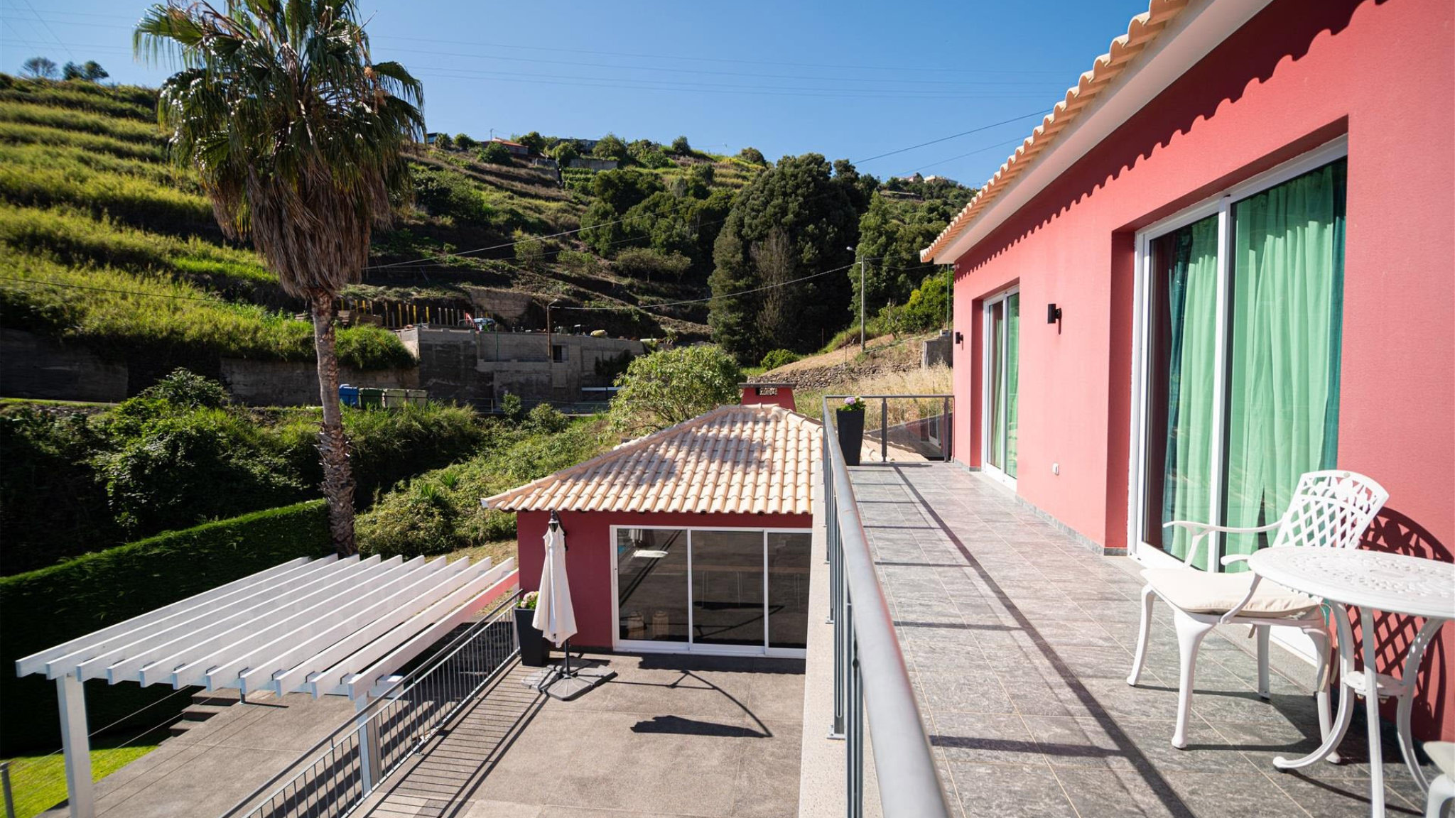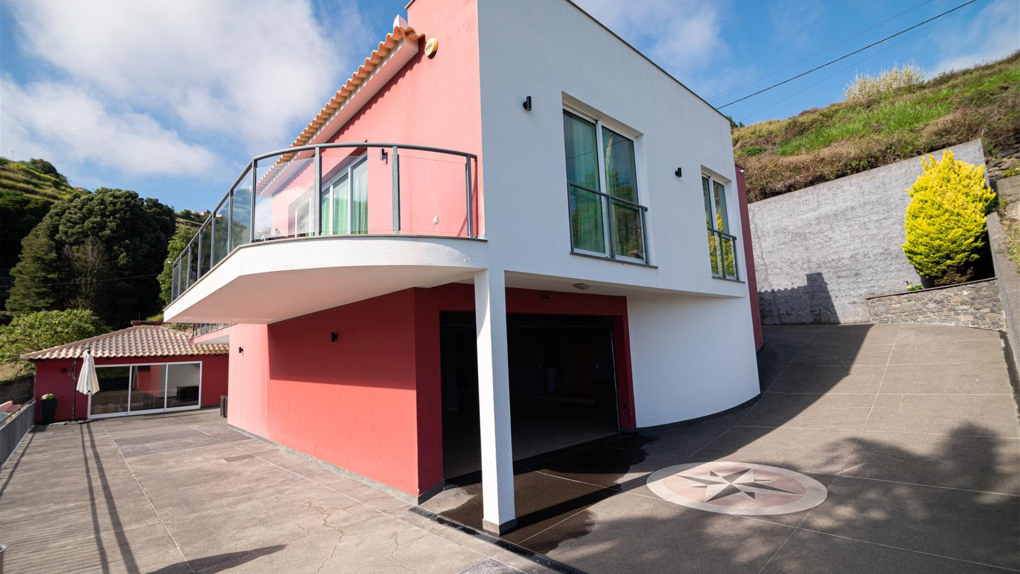 There is also a further bathroom. The bedrooms share an exclusive balcony, which offers a unique panoramic view. In the basement there is a large garage with space for up to six vehicles. There is also another bathroom and a large utility room on this level. Another highlight is the large multi-purpose room located next to the garage, which can be used as a playroom, office or even an additional bedroom with access to the outside. In the outdoor area there is a terrace and another outbuilding with a complete kitchen, barbecue area and dining area. The property is completed by a swimming pool and well-maintained gardens, inviting you to spend relaxing moments in the sun. The town centre of Calheta is only a few minutes away, where you can find all the necessary services for daily life.