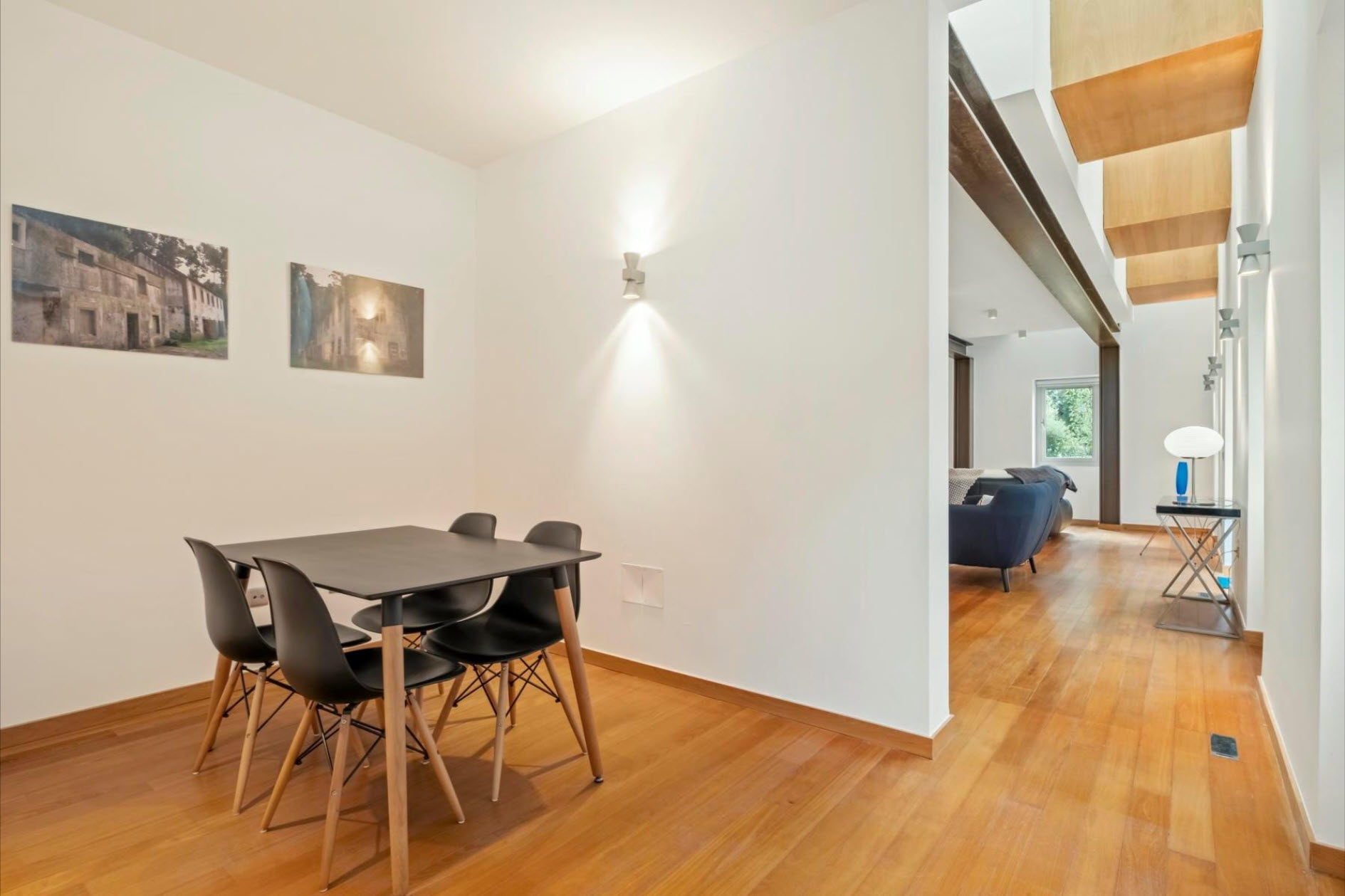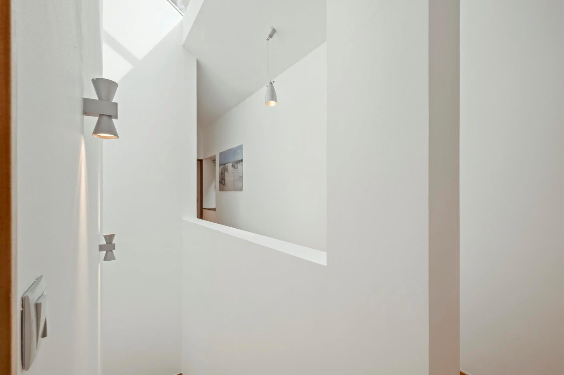 Upstairs are three elegant bedrooms, each with its own bathroom. An ingenious architectural solution creates visual lightness: the bedrooms appear to float thanks to recessed walls and the flood of light. The outbuilding, built to replace the old bakery, comprises two floors. It offers the opportunity to create a cozy living and kitchen area on the first floor and two further bedrooms on the upper floor - ideal for guests or as a retreat. The property extends over a 2,700 m² plot and blends harmoniously into the quiet residential area. The combination of historical heritage and modern lightness creates a unique ambience.
