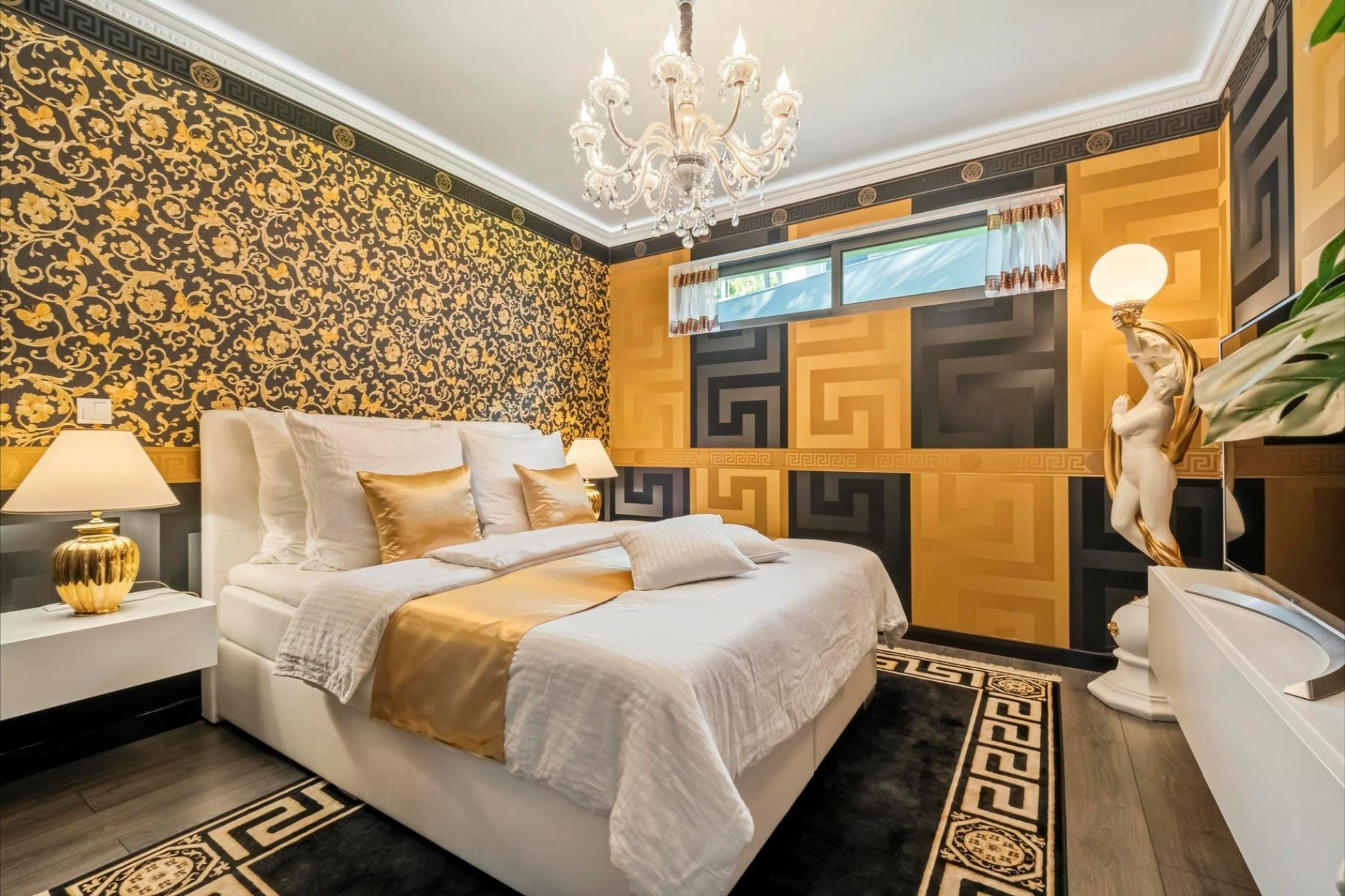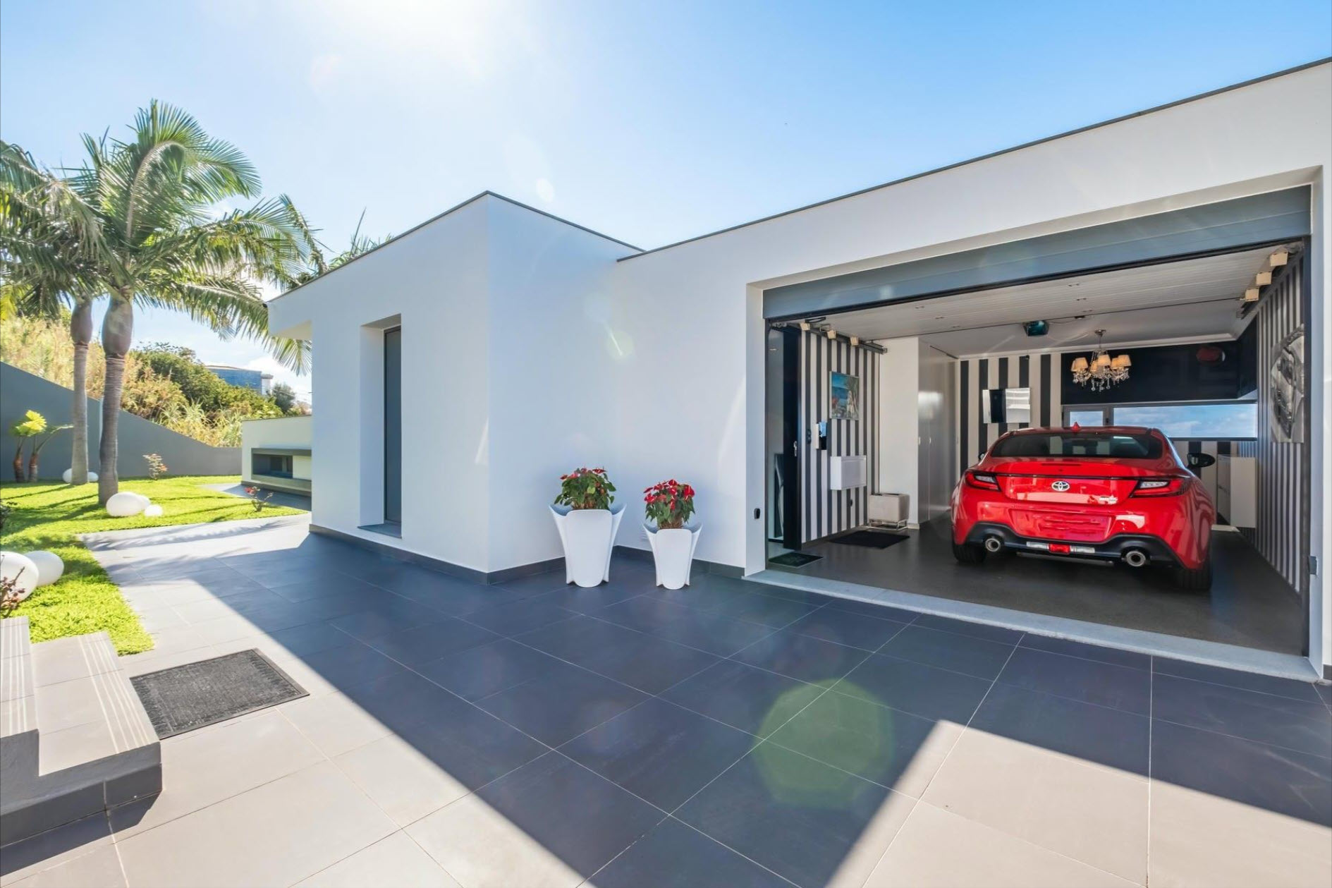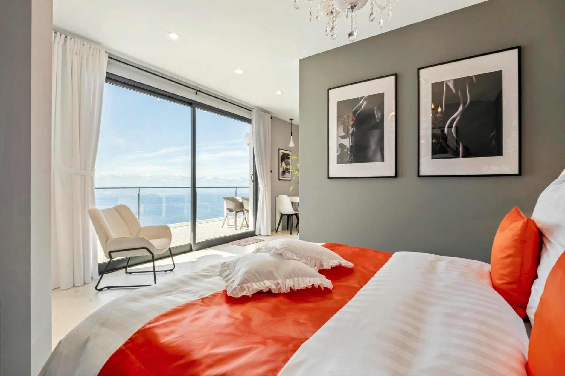 Located in a sun-drenched area, this stunning villa offers unparalleled ocean views, blending modern elegance with the surrounding natural beauty. With 317 sqm of living space spread across multiple levels, the property allows for daily living on a single floor. The ground level includes a three-car garage, entrance hall, open-plan kitchen and living room, a full bathroom, and three bedrooms, including a luxurious master suite with a fireplace and large walk-in closet. Each bedroom exudes elegance with exclusive Joop and Versace wallpaper.