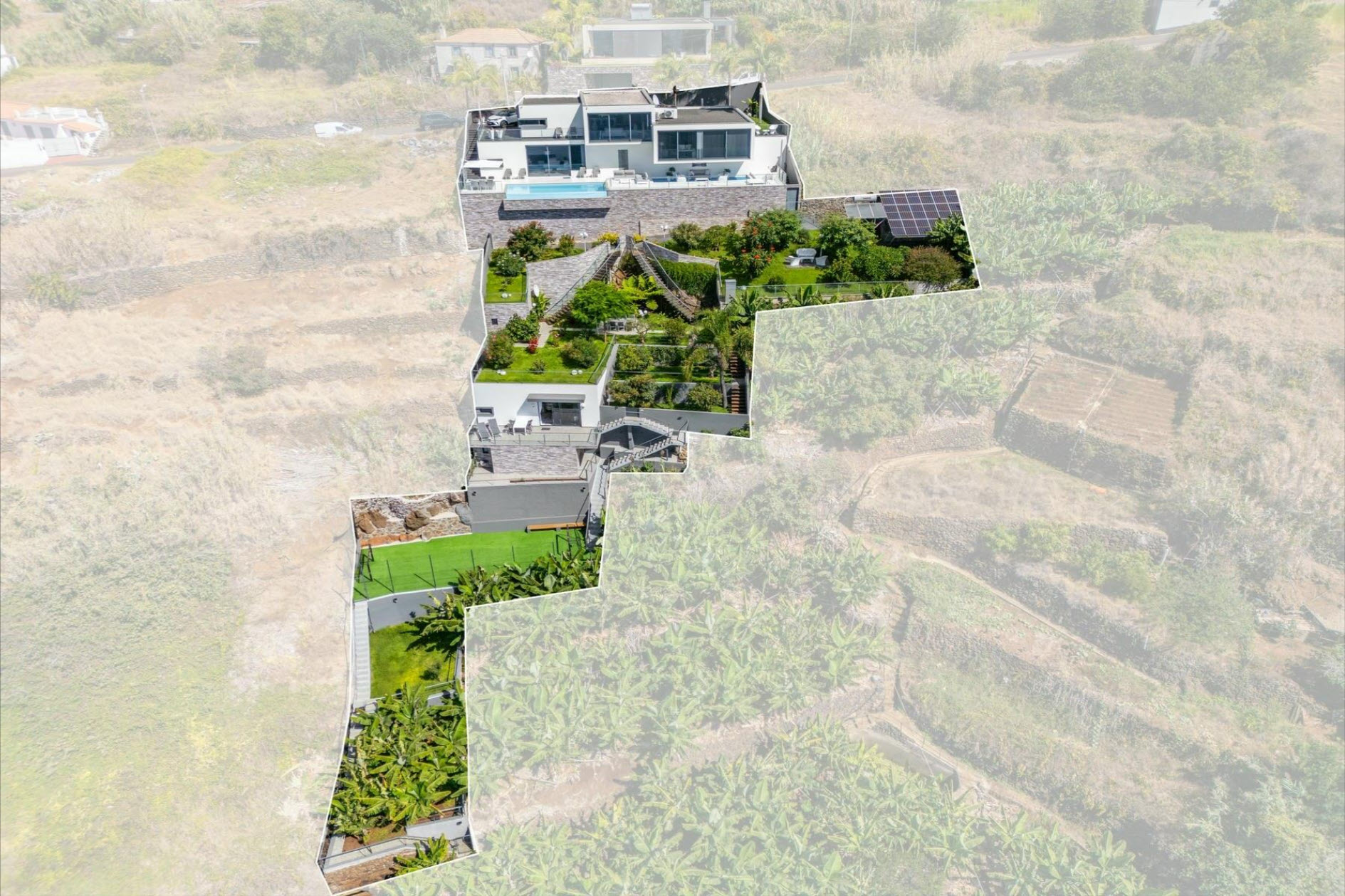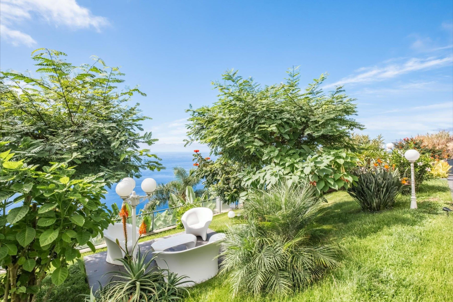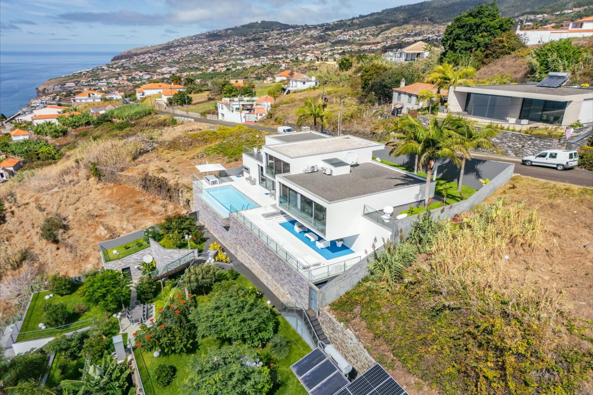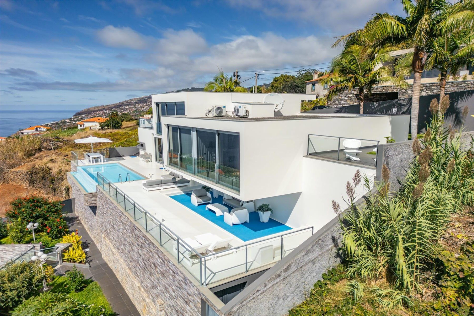 Large windows, air conditioning, underfloor heating, and soft lighting create an inviting atmosphere with panoramic ocean views. The lower level features a cozy lounge with a fireplace, a guest bathroom, and a fully equipped kitchen with direct access to the heated pool, which seems to merge with the ocean horizon. The outdoor areas, with stylish sofas and a heated lounge, are ideal for relaxation. A lush tropical garden, equipped with an irrigation system and lighting, creates a green oasis. The outdoor dining area, complete with a barbecue and Italian designer furniture, is perfect for hosting friends and family. An independent apartment with a private terrace ensures guest privacy. The property also includes a sports field with synthetic grass, a luxury sauna with a fitness area, and a private spa. This villa offers the ultimate in luxury, privacy, and comfort with breathtaking ocean views.