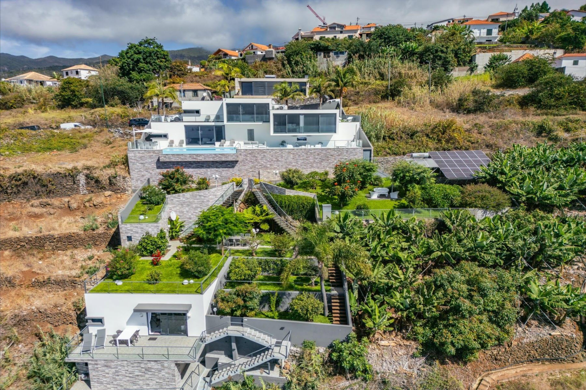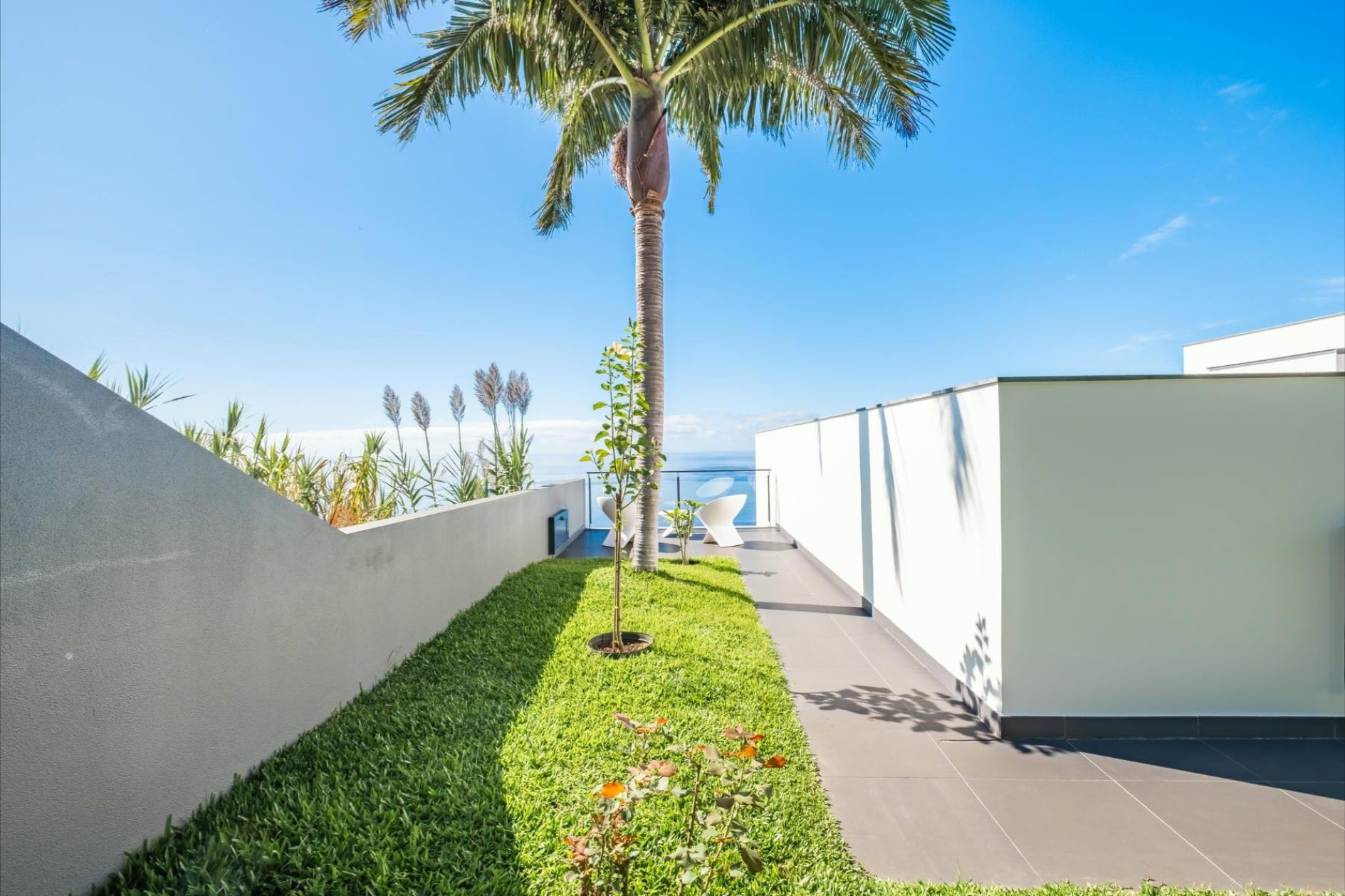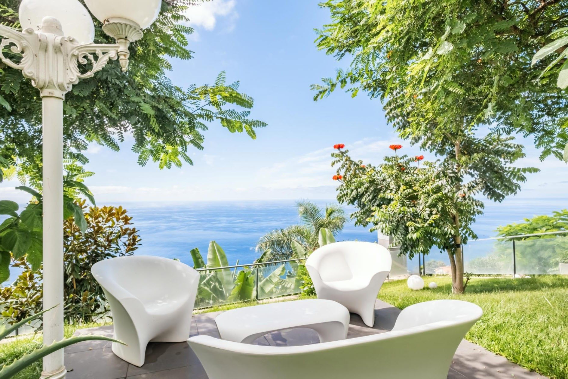 Large windows, air conditioning, underfloor heating, and soft lighting create an inviting atmosphere with panoramic ocean views. The lower level features a cozy lounge with a fireplace, a guest bathroom, and a fully equipped kitchen with direct access to the heated pool, which seems to merge with the ocean horizon. The outdoor areas, with stylish sofas and a heated lounge, are ideal for relaxation. A lush tropical garden, equipped with an irrigation system and lighting, creates a green oasis. The outdoor dining area, complete with a barbecue and Italian designer furniture, is perfect for hosting friends and family. An independent apartment with a private terrace ensures guest privacy. The property also includes a sports field with synthetic grass, a luxury sauna with a fitness area, and a private spa. This villa offers the ultimate in luxury, privacy, and comfort with breathtaking ocean views.