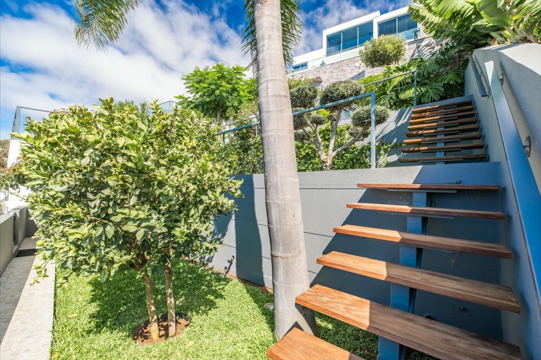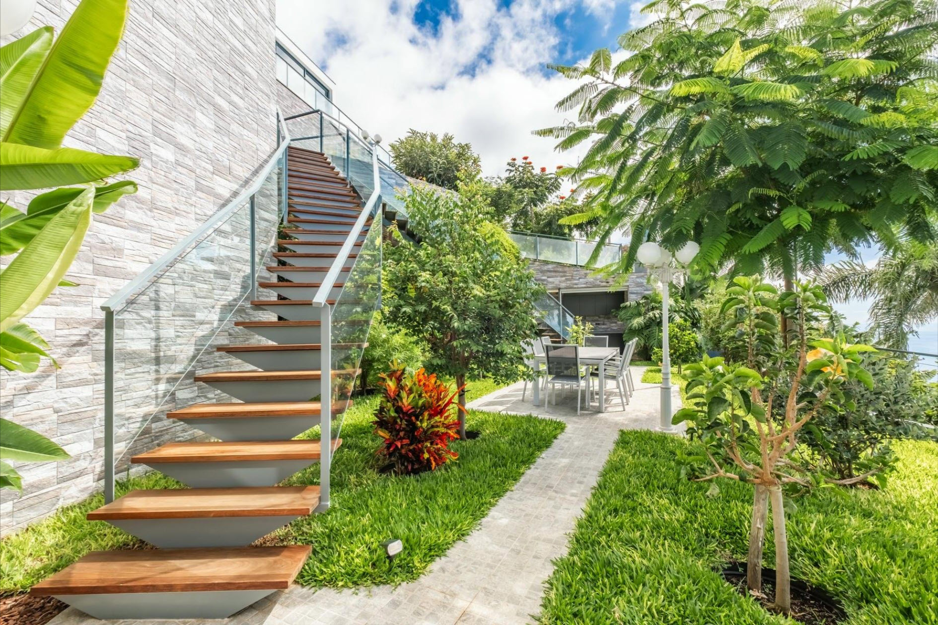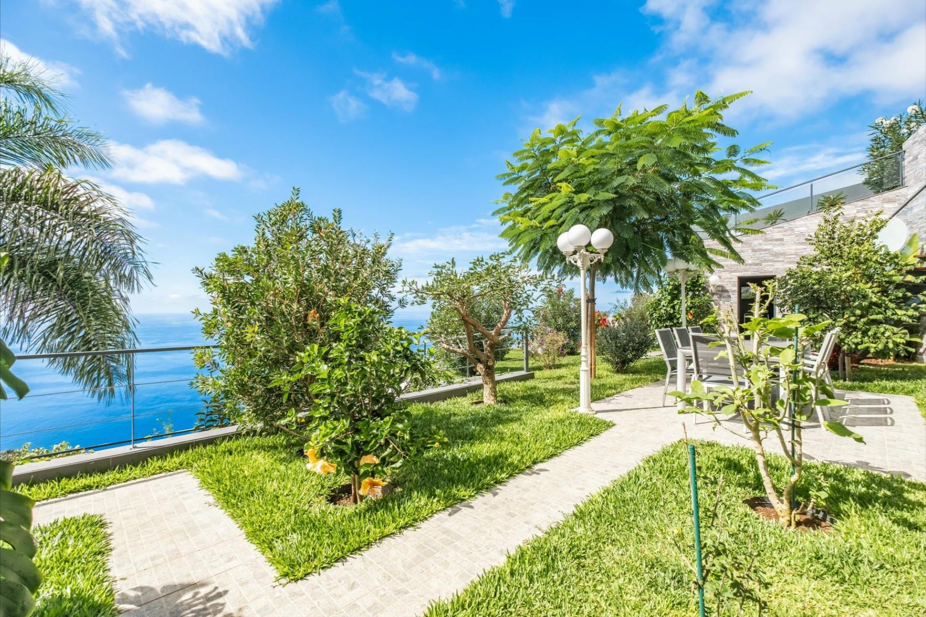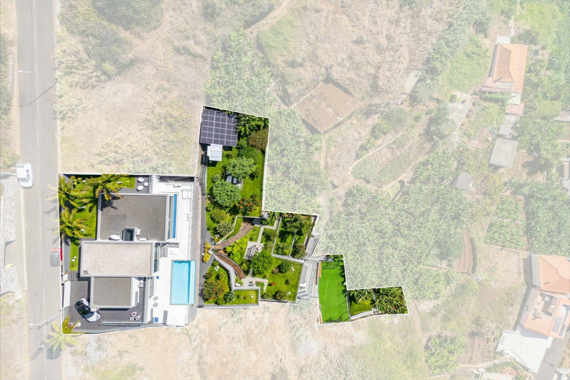 Large windows, air conditioning, underfloor heating, and soft lighting create an inviting atmosphere with panoramic ocean views. The lower level features a cozy lounge with a fireplace, a guest bathroom, and a fully equipped kitchen with direct access to the heated pool, which seems to merge with the ocean horizon. The outdoor areas, with stylish sofas and a heated lounge, are ideal for relaxation. A lush tropical garden, equipped with an irrigation system and lighting, creates a green oasis. The outdoor dining area, complete with a barbecue and Italian designer furniture, is perfect for hosting friends and family. An independent apartment with a private terrace ensures guest privacy. The property also includes a sports field with synthetic grass, a luxury sauna with a fitness area, and a private spa. This villa offers the ultimate in luxury, privacy, and comfort with breathtaking ocean views.
