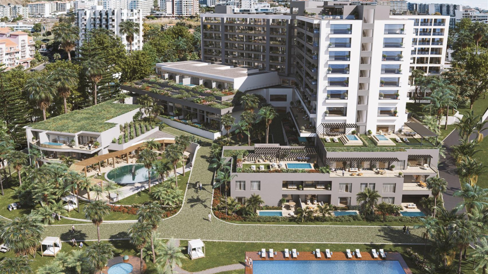 The complex also offers dedicated service areas, carefully manicured gardens and an unrivalled location close to all daily necessities and services. The flat itself extends over a generous living space and is thoughtfully divided into three bedrooms, each with its own bathroom. There is a further bedroom without its own bathroom. The separate kitchen offers direct access to a spacious balcony, ideal for enjoying Madeira's sunny days. Thanks to its south-facing orientation, the flat is always bright and inviting. High-quality fittings and tasteful design characterise every detail of this property. With over 7000 square metres of surrounding gardens, large trees and an exclusive lift providing direct access to Praia Formosa, this flat represents a unique and incomparable investment. Its proximity to the Forum Madeira shopping centre, public transport, main roads and the Lido tourist area complete the offer. Fulfil your dream of an exclusive home where luxury and comfort meet in an incomparable way.